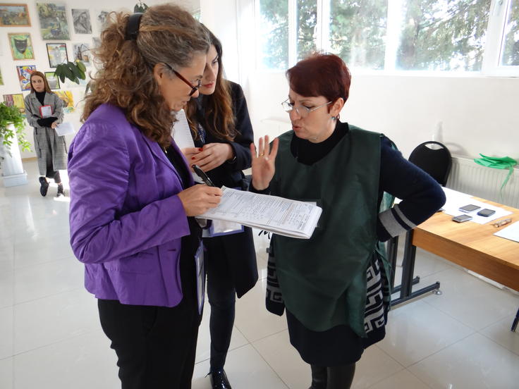 კორინ იონკერი, ეუთოს დემოკრატიული ინსტიტუტებისა და ადამიანის უფლებების ოფისის არჩევნებზე სადამკვირვებლო მისიის ხელმძღვანელი მცხეთაში საუბნო საარჩევნო კომისიის თავმჯდომარეს ესაუბრება 2017 წლის 21 ოქტომბრის ადგილობრივი თვითმმართველობის არჩევნებზე, საქართველო.