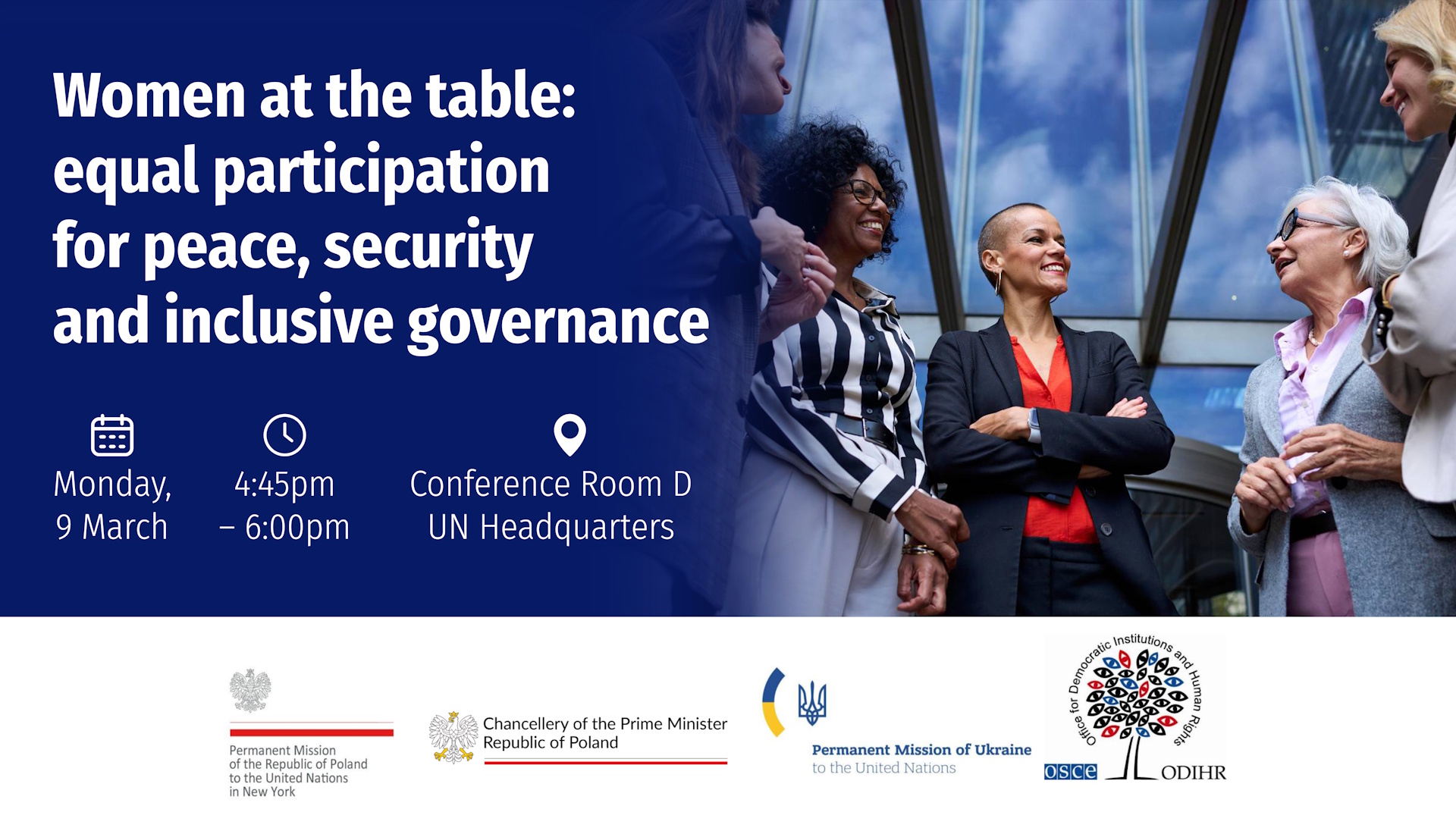 Event banner with text about equal participation for peace, security and inclusive governance, featuring logos of ODIHR, the Permanent Mission of the Republic of Poland to the UN in New York, the Chancellery of the Prime Minister, Poland, and the Permanent Mission of Ukraine to the UN. Image of smiling women discussing.