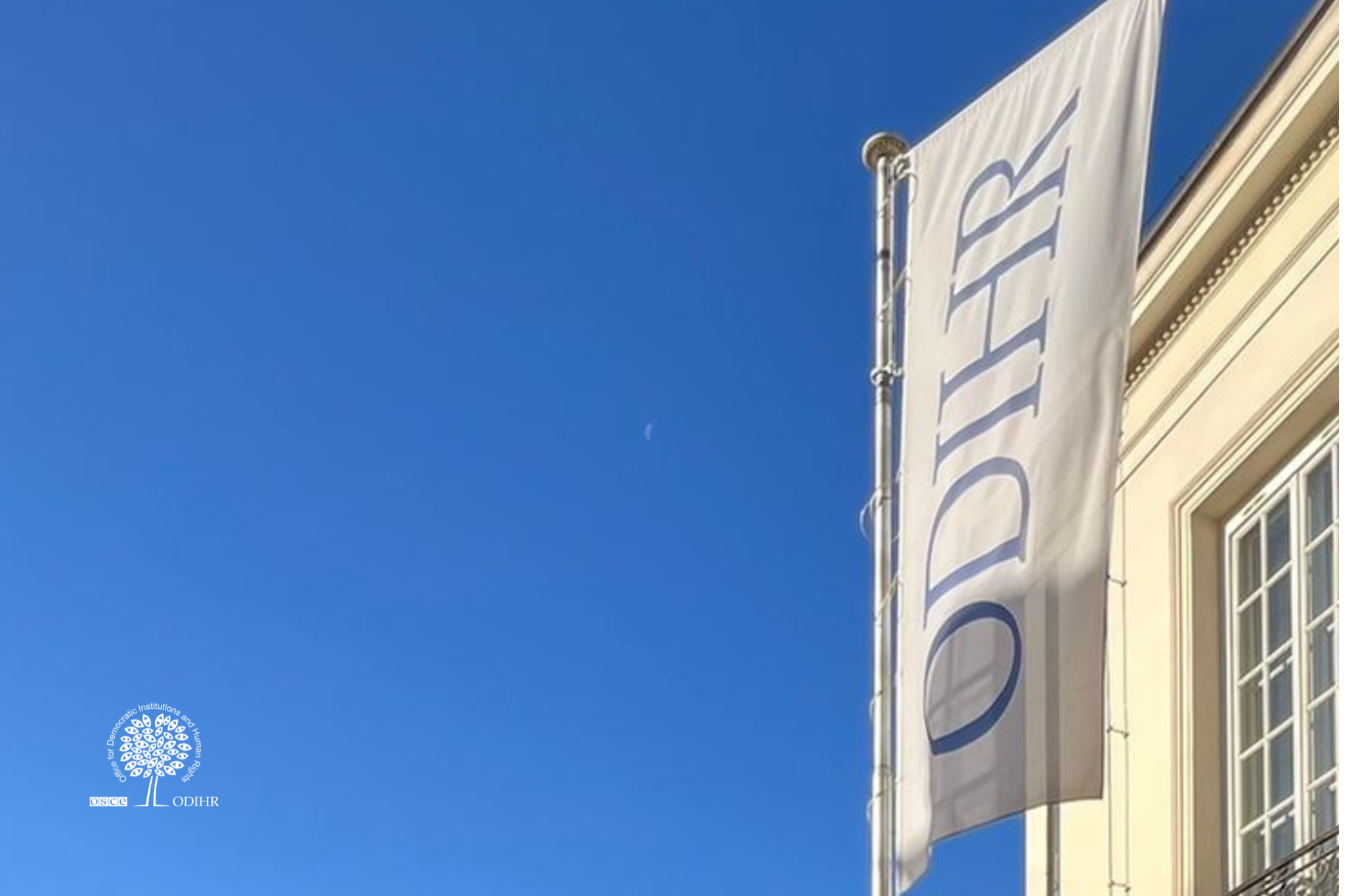 Flag with "ODIHR" text on a building against a clear blue sky.