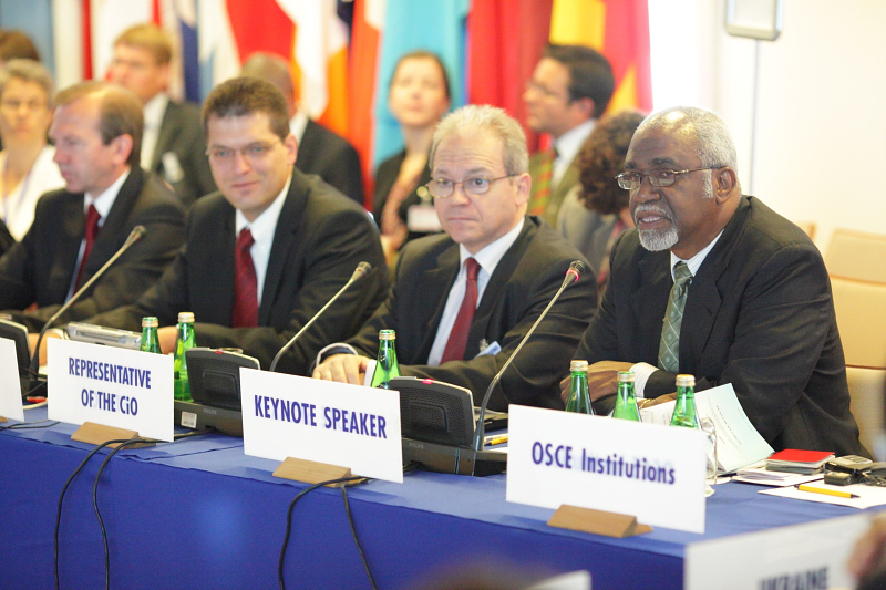 Judge Patrick Robinson (r), President of the International Criminal Tribunal for the former Yugoslavia, gives the keynote speech at an OSCE meeting on the rule of law, Warsaw, 12 May 2009. ODIHR Director Ambassador Janez Lenarcic (l) opened the event.