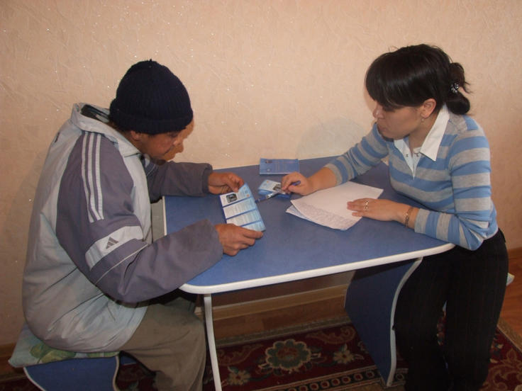 Shahnoza Khasanova, project consultant with the Sana Sezim NGO from Shymkent, Kazakhstan, discusses with an Uzbek migrant labourer a booklet (funded by ODIHR) offering legal advice to those seeking to avoid being trafficked or exploited, 10 February 2009.