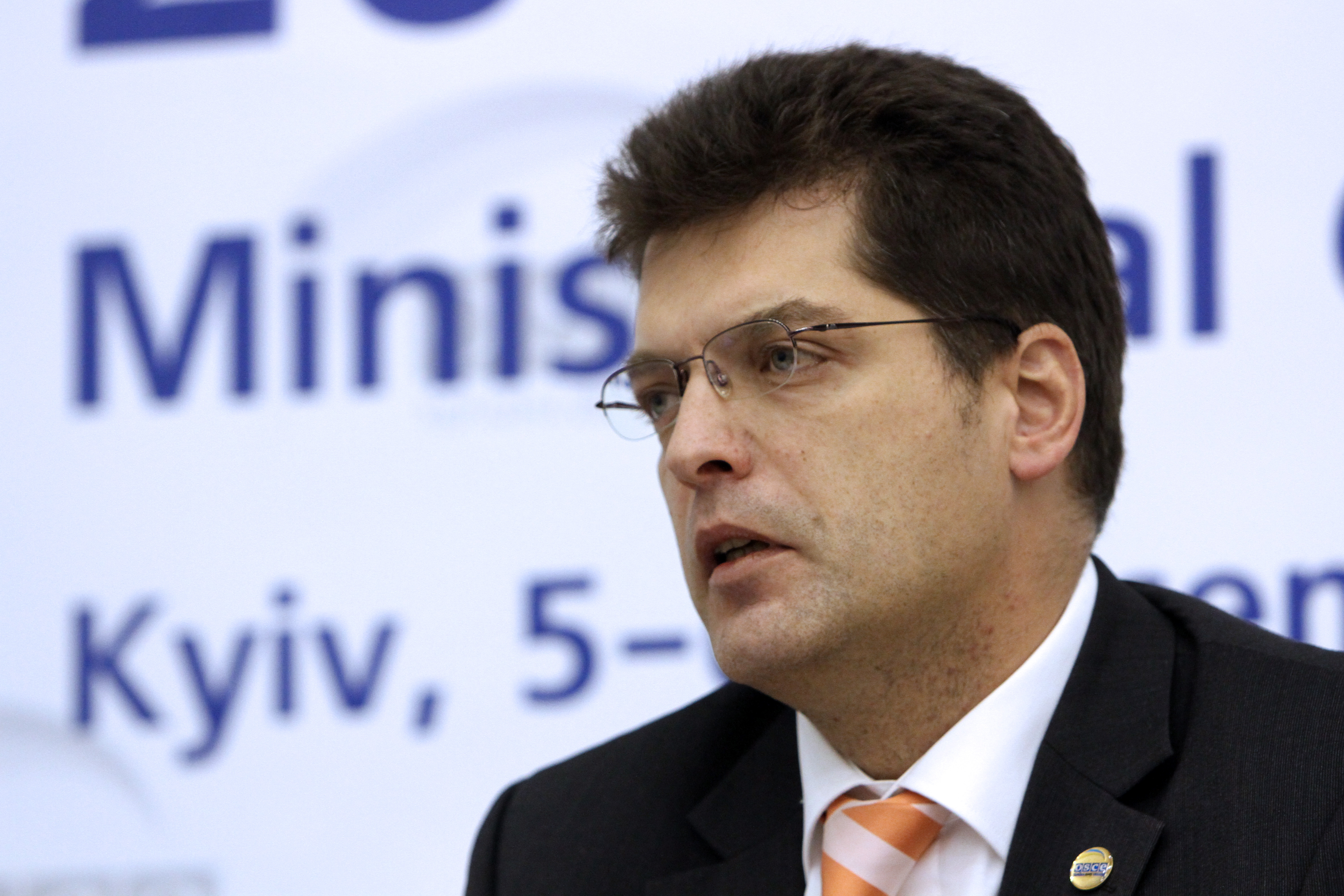 Janez Lenarčič, the Director of the OSCE Office for Democratic Institutions and Human Rights, delivers a briefing to journalists at the OSCE Ministerial Council in Kyiv, 6 December 2013.