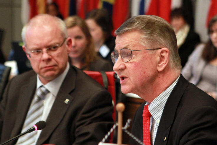 Prof. Brian Burdekin (right) gives the keynote speech during the OSCE Supplementary Human Dimension Meeting on national human rights institutions, while Lithuania's Ambassador Renatas Norkus looks on, Vienna, 14 April 2011.