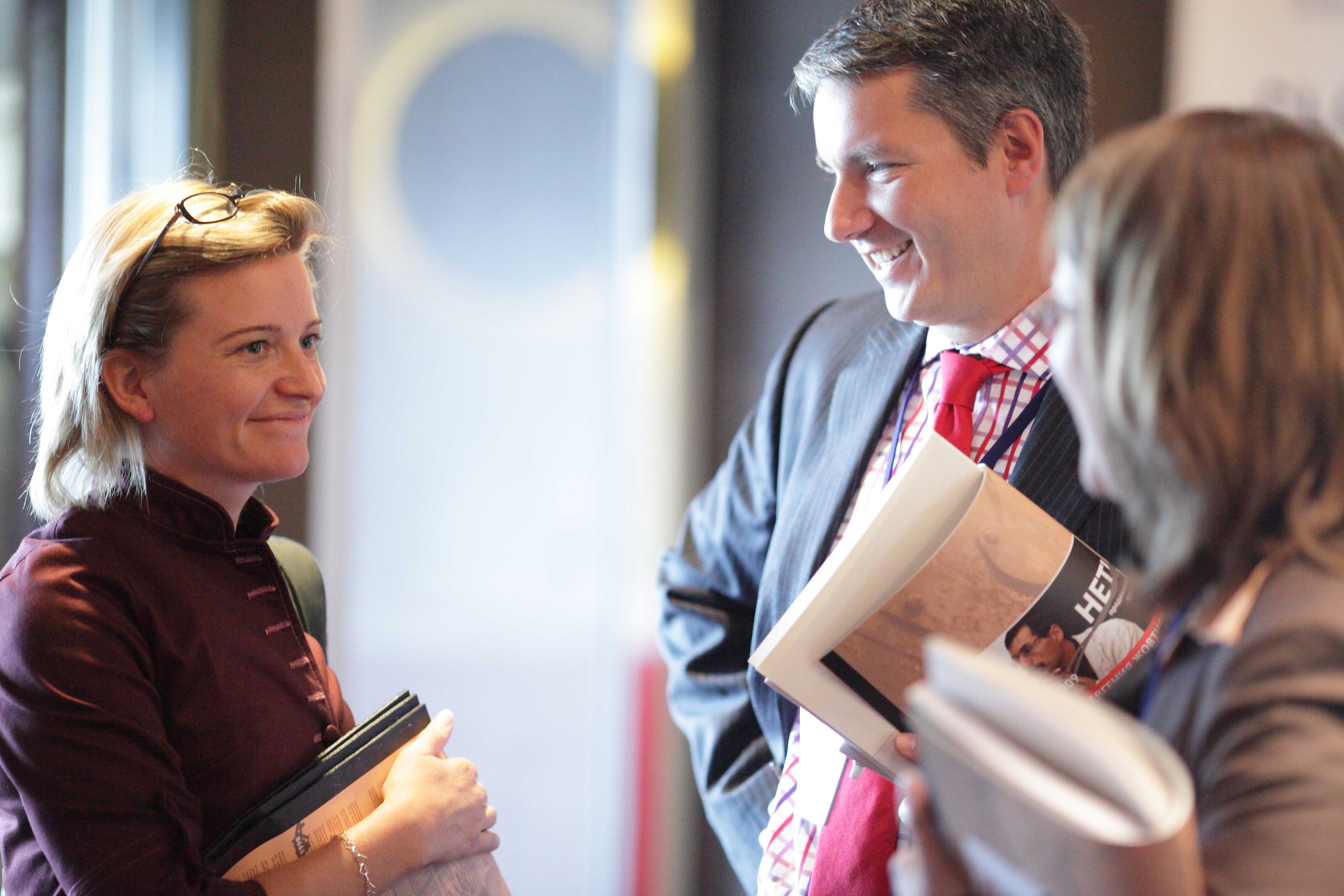 Christopher Decker, Director, Department of Human Rights and Communities, OMIK Headquarters, Pristina, talks to Linda Öhman, who manages ODIHR's Human Rights, Women and Security Programme, at the HDIM in Warsaw, 30 September 2009.