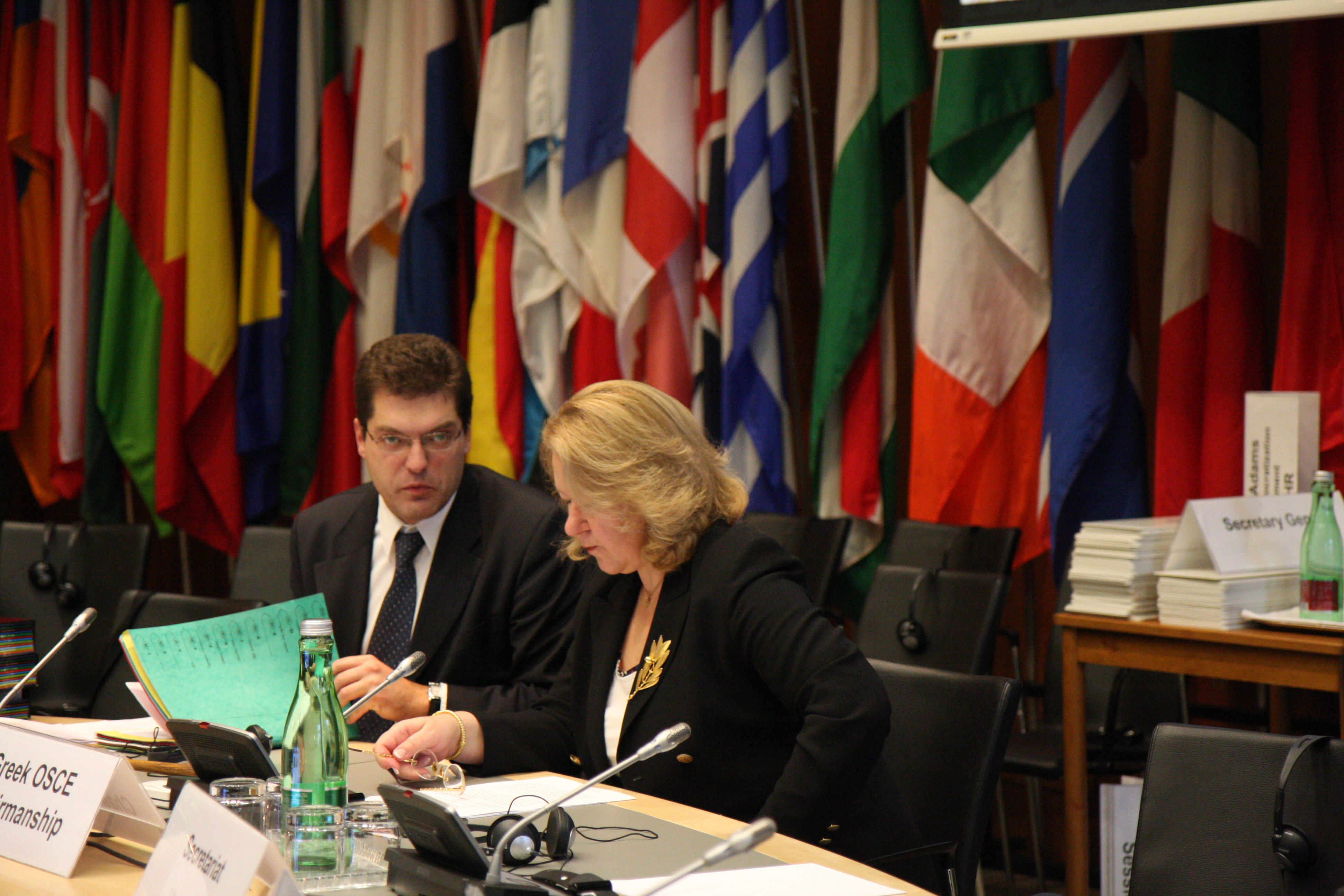 ODIHR Director Ambassador Janez Lenarcic speaks to a Ambassador Eleni Sourani, representing the Greek Chairmanship of the OSCE, before the opening of a meeting on combating violence against women, Vienna, 5 November 2009.