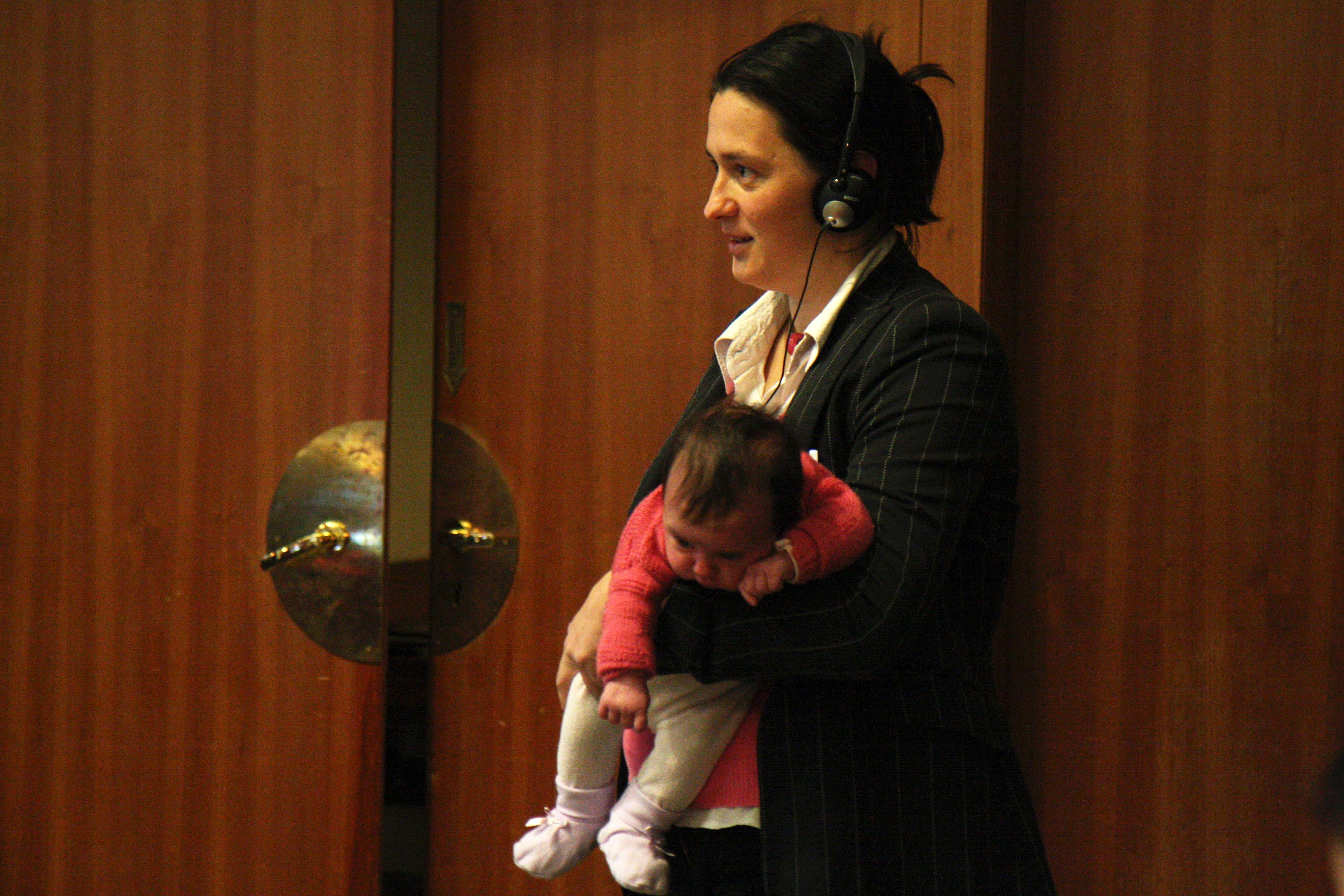 A participant listens with her baby to proceedings at a conference on combating violence against women, Vienna, 5 November 2009.