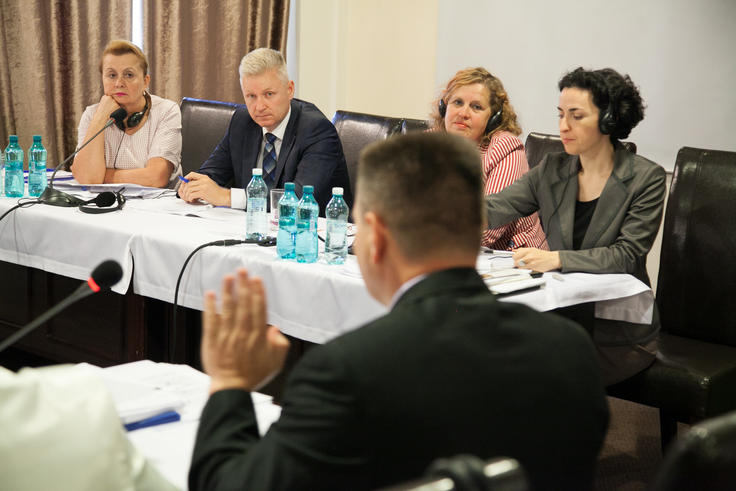 Svetlana Novak, Head of the Evaluation Board, Victor Micu, President of the Superior Council of Magistracy, Rita Tamm, Human Dimension Officer at the OSCE Mission to Moldova, and Tina Gewis, Chief Rule of Law at ODIHR, (l-r) listen Ghennadi Eni from the Evaluation Board at meeting on performance evaluation of judges in Moldova, Chisinau, 27 June 2014.
