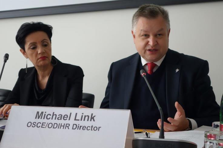 Michael Georg Link (r), with Ambassador Miroslava Beham, the OSCE Senior Adviser on Gender Issues (l), speaks at a Roma and Sinti women consultation meeting hosted by ODIHR CPRSI as part of the OSCE Gender Equality Conference in Vienna, 10 July 2014