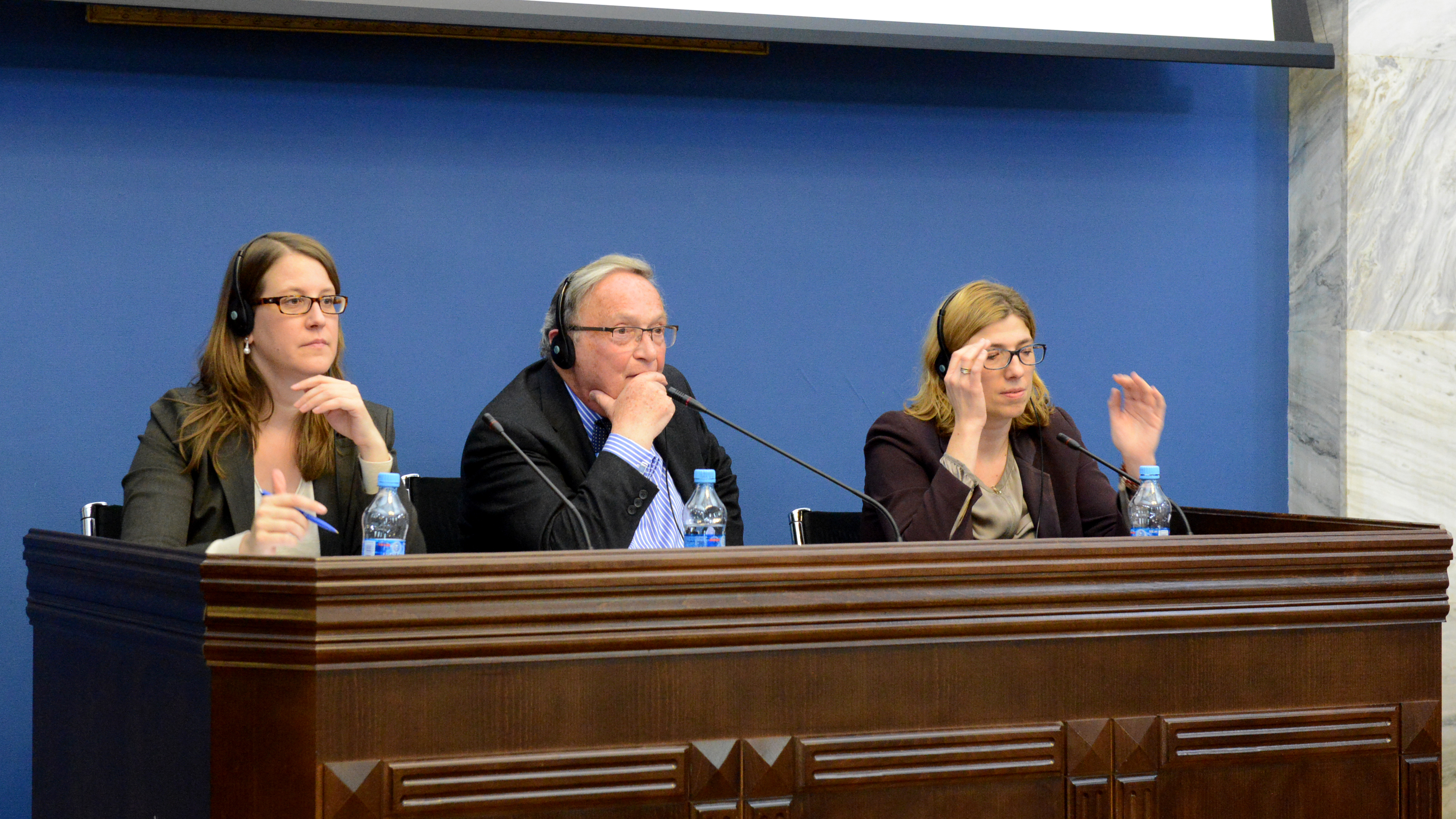 Alice Thomas (l), ODIHR's Chief of Legislative Support Unit, together with St. John Bates (c), Independent Law Making Consultant from the United Kingdom and Otylia Trzaskalska-Stroińska (r), Deputy Director of the Innovation and Industry Department of the Ministry of Economy of Poland, during a law-making workshop in Tbilisi, Georgia, 20 November 2015
