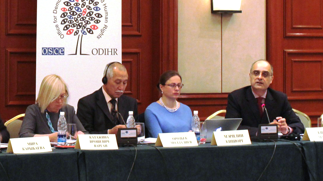 Kishan Manocha (r), ODIHR's Senior Adviser on Freedom of Religion or Belief, speaking at an event on legal recognition of religious or belief communities in Kyrgyzstan, while Katarzyna Jarosiewicz-Wargan (l), Head of ODIHR's Human Rights Department, Orozbek Moldaliyev (c-l), Director of the State Commission on Religious Affairs of the Kyrgyz Republic and Merilin Kiviorg (c-r), Senior Research Fellow in public international law and human rights at University of Tartu, Estonia listen, in Bishkek, 3 February 2016