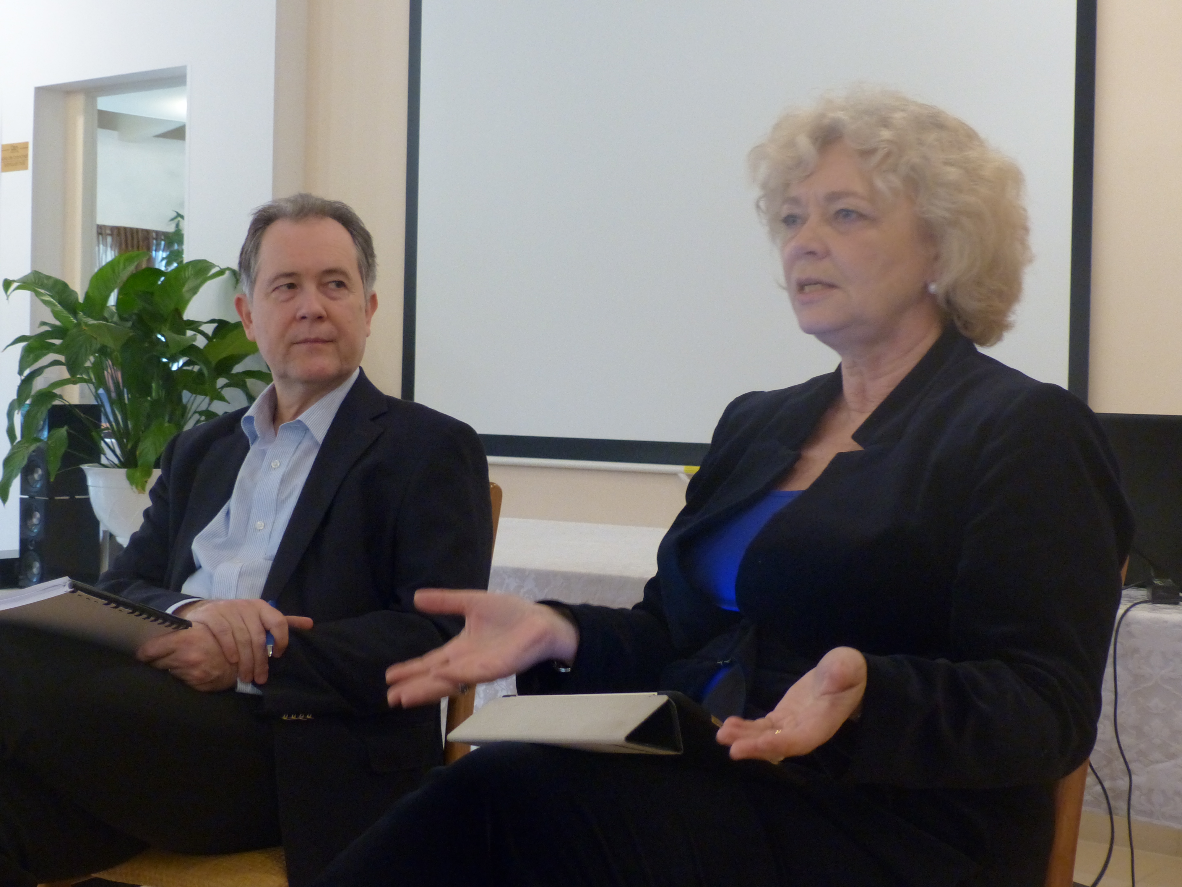 Maria Leissner, Secretary-General of the Community of Democracies (r), discusses building networks of strong leaders with Pavol Demes, a foreign policy analyst (l), at an ODIHR and the Community of Democracies policy advisers course in Moldova, 28 February 2016.