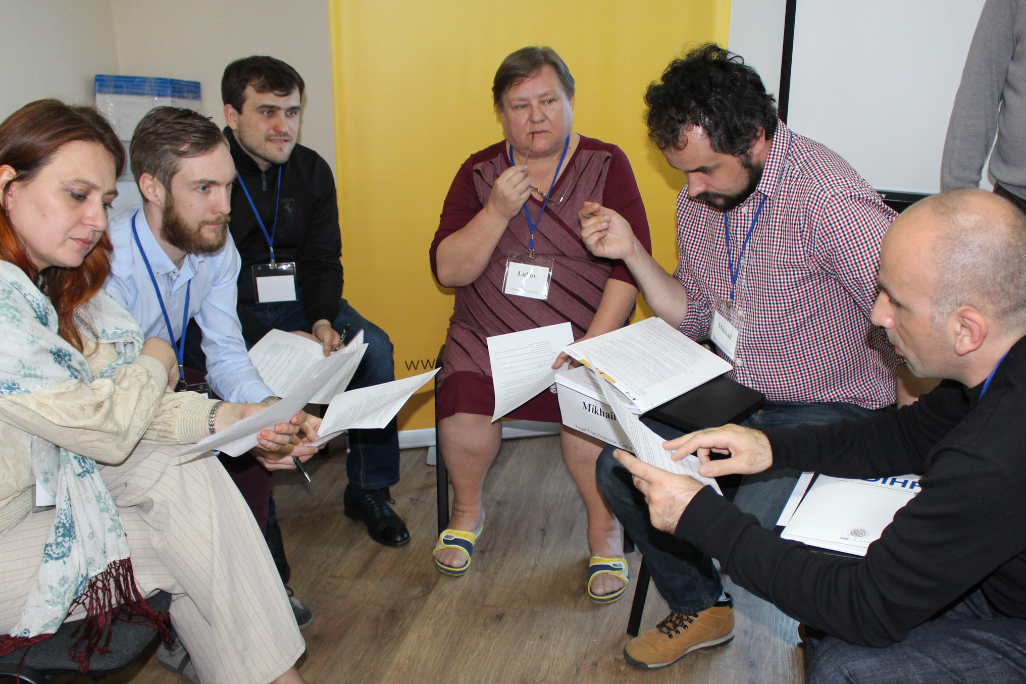 Training participants discuss trial-monitoring methodology at an ODIHR workshop on 7 April 2016 in Chernihiv, Ukraine.