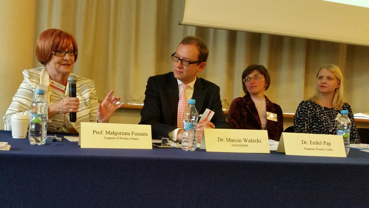 Małgorzata Fuszara (l), from Poland's Congress of Women, speaking at 8th Annual Congress of Women, as Marcin Walecki (c-l), Head of ODIHR's Democratization Department, Enikő Pap (c-r), Legal Expert for the Hungarian Women’s Lobby, and Tiina Kukkamaa-Bah (r), Chief of ODIHR's Democratic Governance and Gender Unit, listen, in Warsaw, 13 May 2016