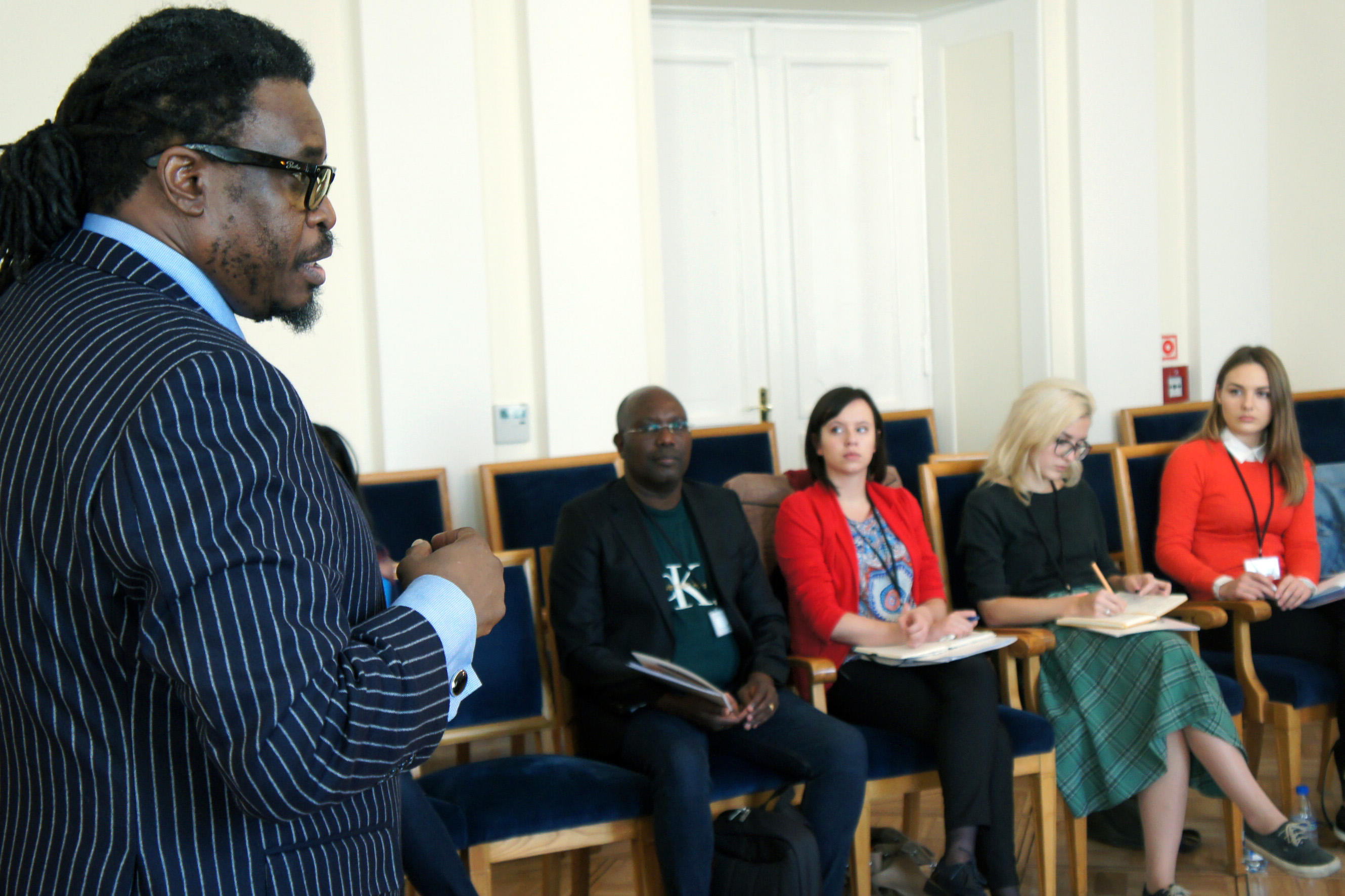 Larry Olomofe, ODIHR’s Adviser on Combating Racism and Xenophobia, presenting at a youth workshop in Warsaw, 26 September 2016.