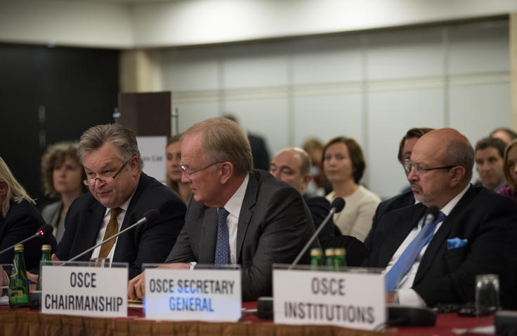 Ambassador Eberhard Pohl, Chairperson of the OSCE Permanent Council (c), and Lamberto Zannier, OSCE Secretary General (r), listen as Michael Georg Link, Director of the OSCE Office for Democratic Institutions and Human Rights, addresses the closing session of the OSCE Human Dimension Implementation Meeting in Warsaw, 30 September 2016.