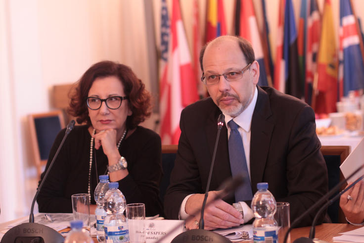 Carla Ciavarella, the Office Director at the General Training Directorate of the Italian Justice Ministry's Penitentiary Adminsitration Department (left), and Howard Sapers, the Correctional Investigator of Canada (right), during an ODIHR-organized meeting on preventing sexual and gender-based violence in criminal justice facilities, Warsaw, 18 October 2016.