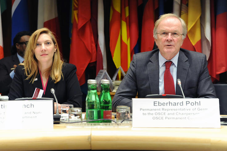 Ambassador Eberhard Pohl, Permanent Representative of Germany to the OSCE and Chairperson of the OSCE Permanent Council, and Cristina Finch, head of ODIHR’s Tolerance and Non-discrimination Department, at the OSCE/ODIHR Conference on Combating Intolerance and Discrimination against Christians, Vienna, 14 December 2016.