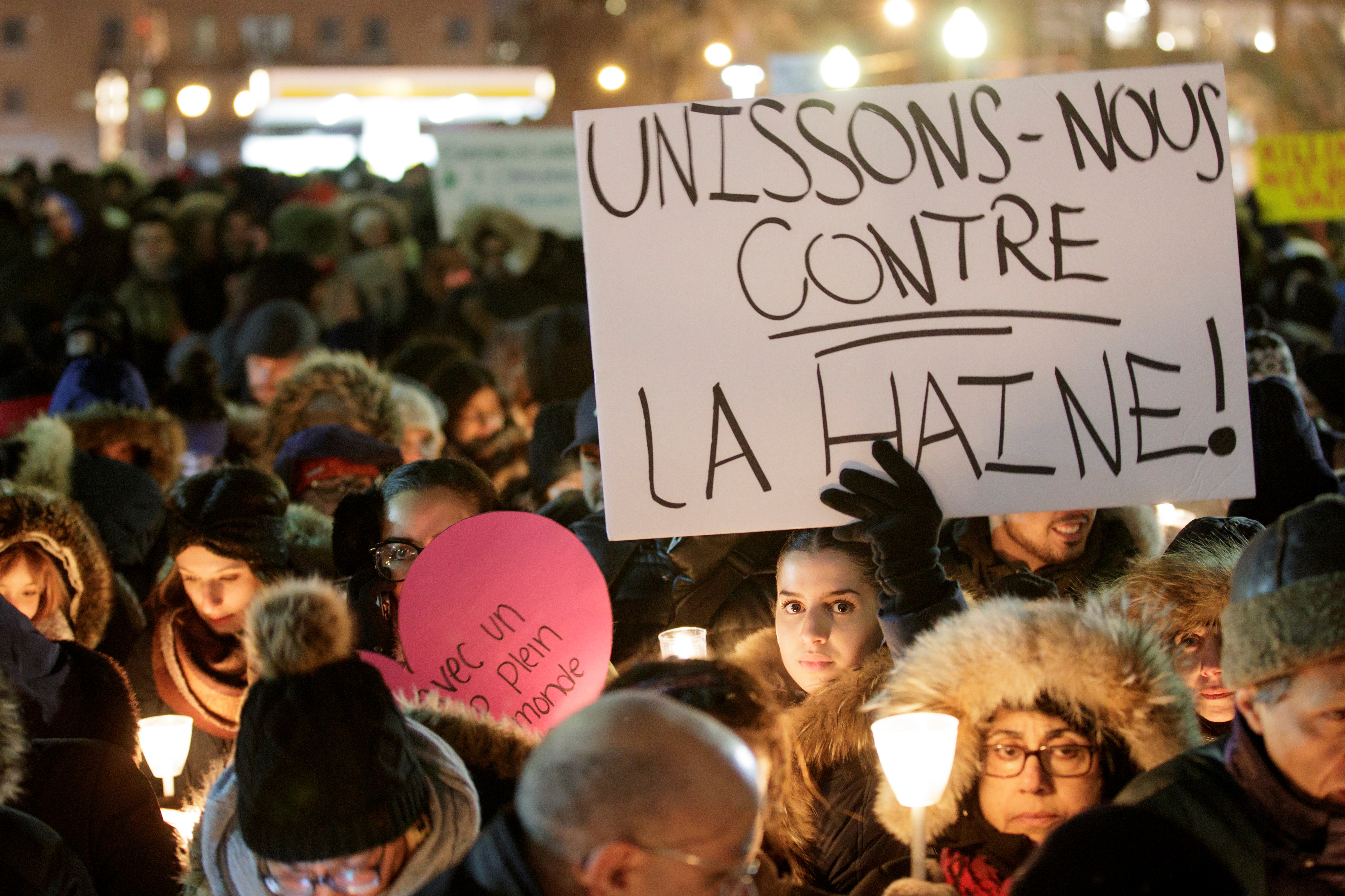 A woman holds a sign reading "Let's unite against hate!" as people attend a vigil in support of the Muslim community in Montreal, Quebec, 30 January 2017.