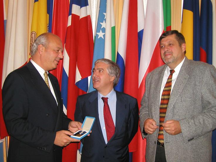 Outgoing ODIHR Director Gerard Stoudmann (left) receives a medal from Secretary General Jan Kubis (right) at the closing of Europe's largest human rights meeting, 19 September 2002.