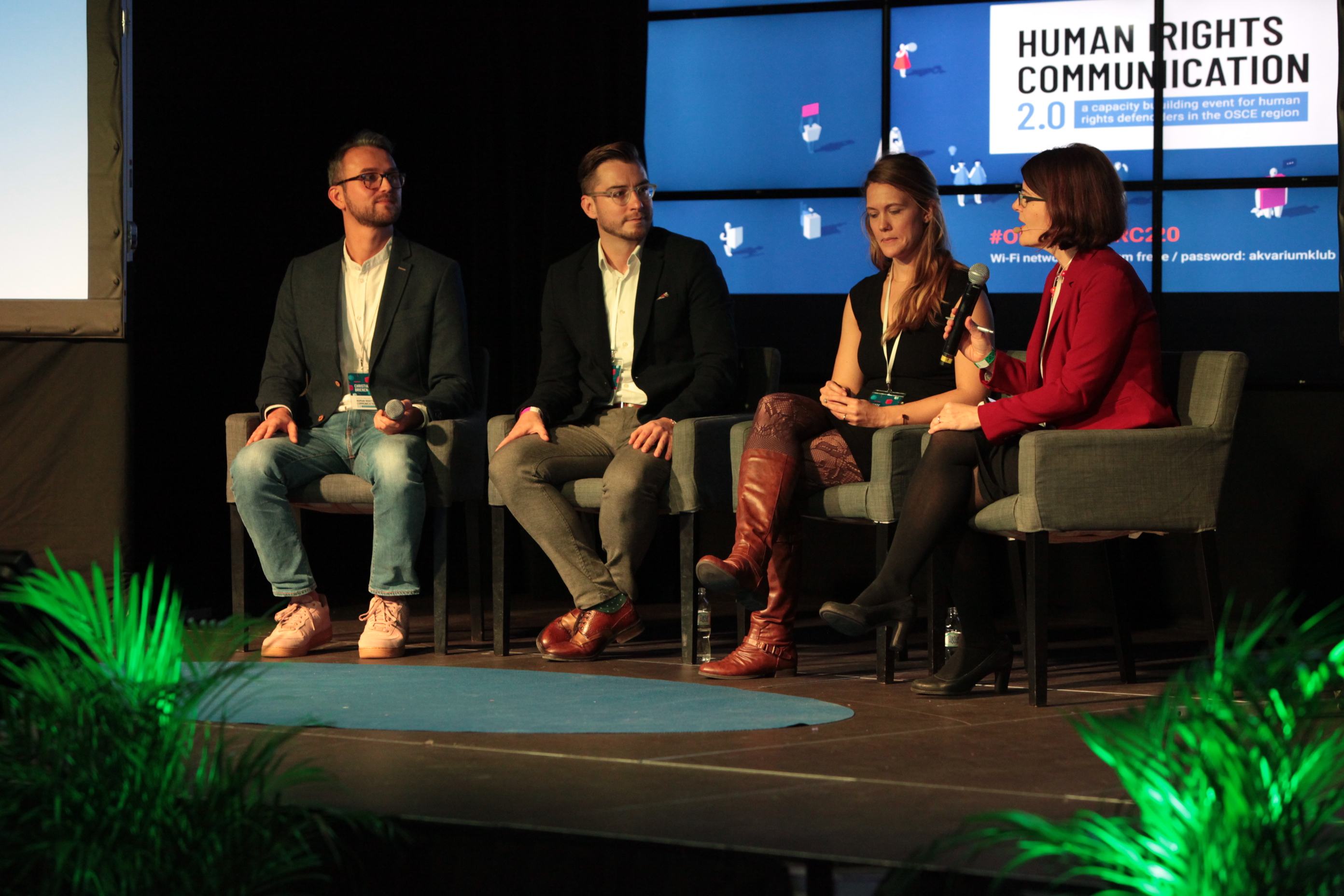 Jennifer Croft, Deputy Head of ODIHR’s Human Rights Department, participates in a panel discussion at the Human Rights Communication 2.0 event in Budapest, alongside Christian Brienen of the Dutch-based PR agency Glasnost (left), Belgium-based communications strategist Tomislav Korman (second from the left) and Kate Evans of the Mindbridge non-profit organization in the United States. 5 December 2017.