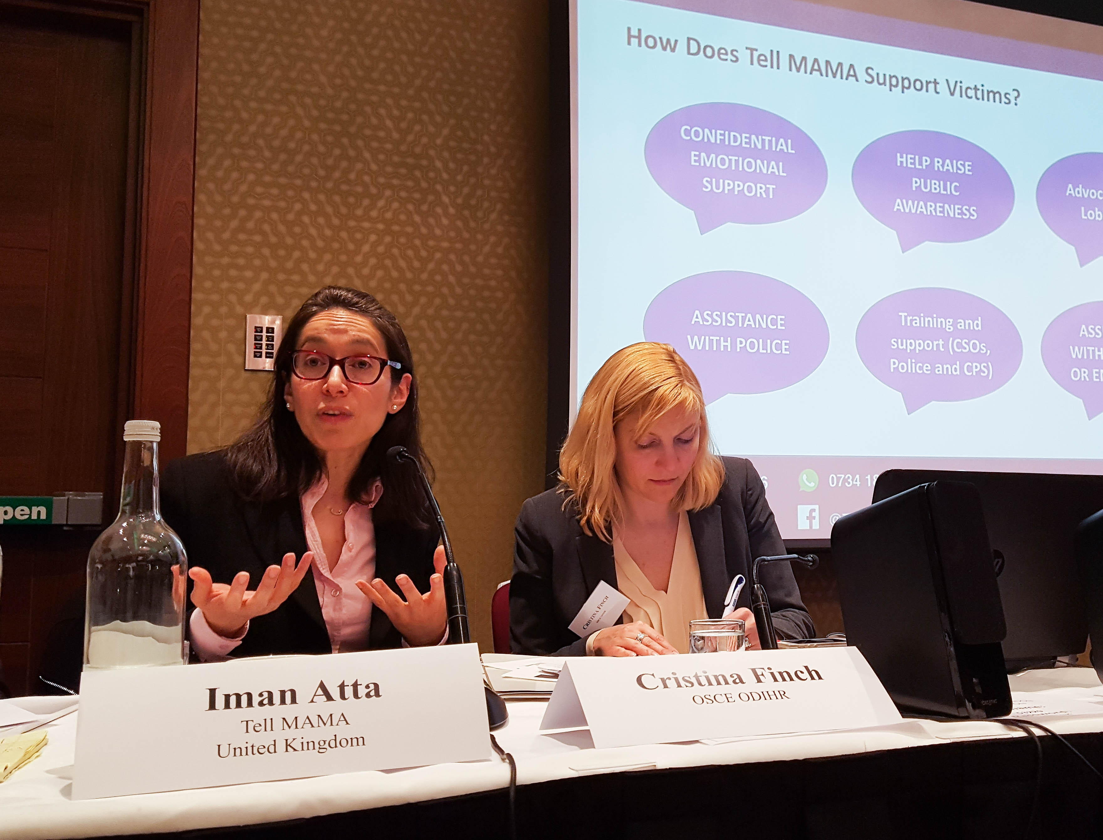Iman Atta, Director of the U.K.-based NGO Tell Mama, speaking during an expert roundtable meeting on countering hate crime against migrants organized by the OSCE Office for Democratic Institutions and Human Rights (ODIHR). Next to her is Cristina Finch, Head of ODIHR's Tolerance and Non-discrimination Department. 27 February 2018, London.
