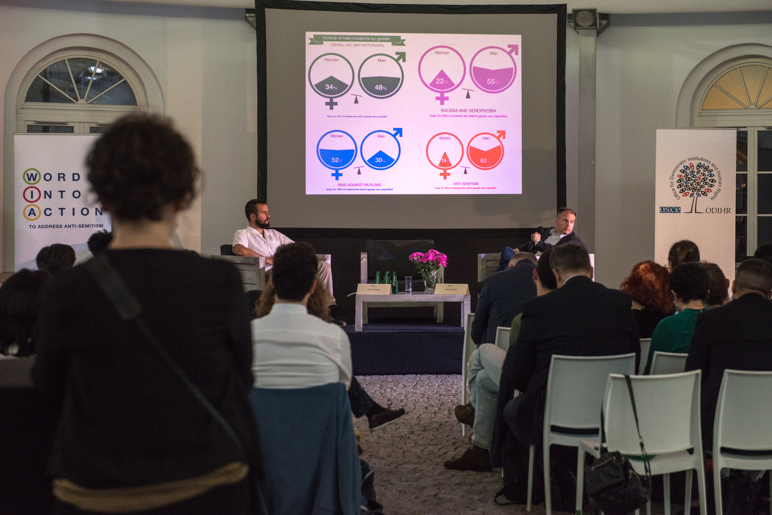 Ales Giao Hanek, ODIHR Hate Crime Officer, and James Stockstill, ODIHR Adviser on Civil Society Relations, presenting hate crime collection practices during the Activist Forum on Preventing and Responding to Hate Crimes, organized by the OSCE Office for Democratic Institutions and Human Rights (ODIHR) as part of its Words Into Action project. Warsaw, 21 June 2018.