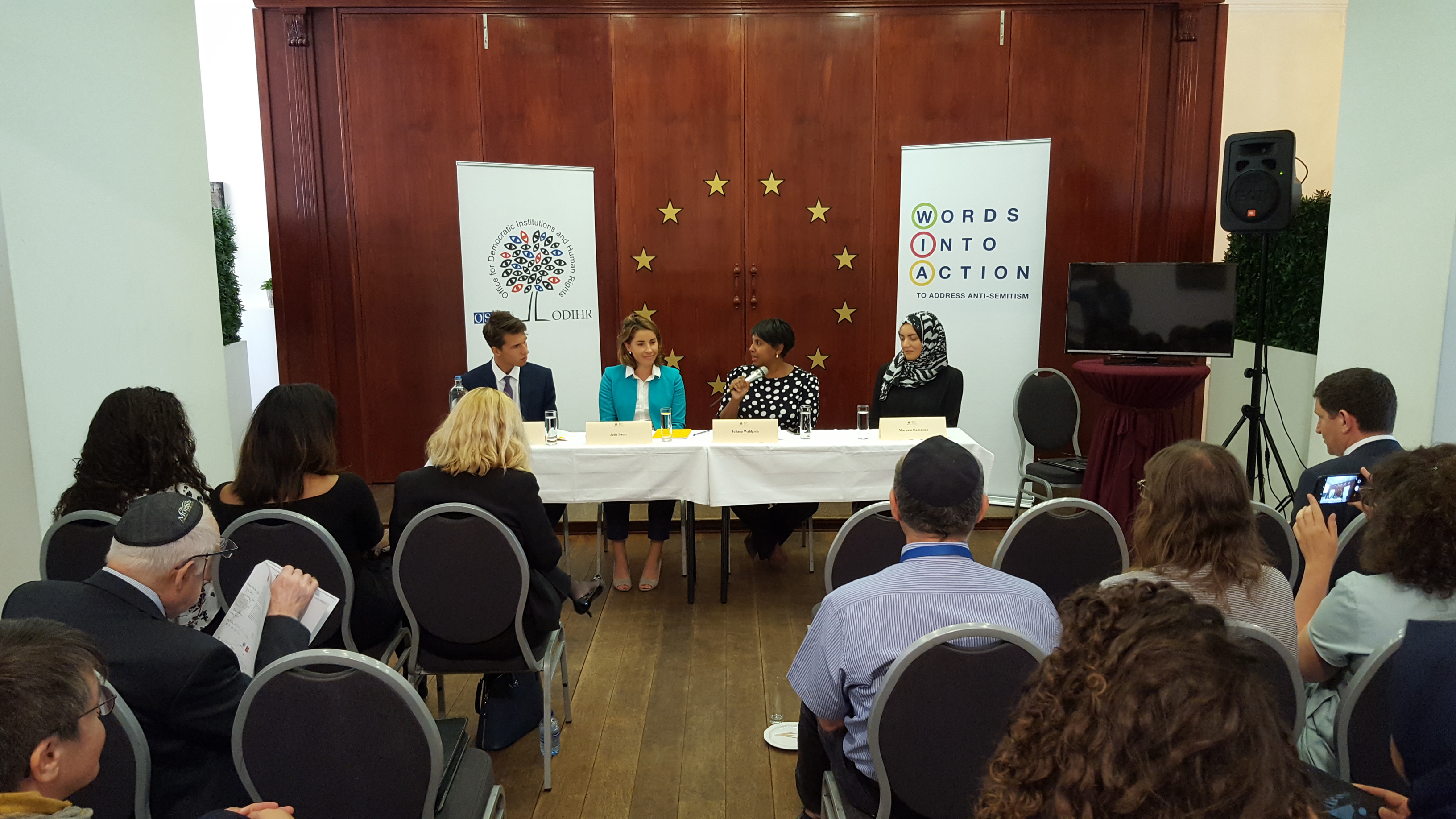 Participants in a panel discussion on the role of civil society in promoting tolerance and non-discrimination, organized as part of the launch event of the ODIHR publication "Coalition Building for Tolerance and Non-Discrimination: A Practical Guide" on 26 June 2018 in Brussels. From right to left: Maryam Hamdoun, Policy Officer with the Equality and Inclusion Cluster of the Open Society Justice Initiative; Juliana Wahlgren, Senior Advocacy and Network Development Officer at the European Network Against Racism (ENAR); Julia Frost, Chief of Staff at the International Centre for Research on Women; and Olaf Stand, President of the Jewish Society of Aberdeen.