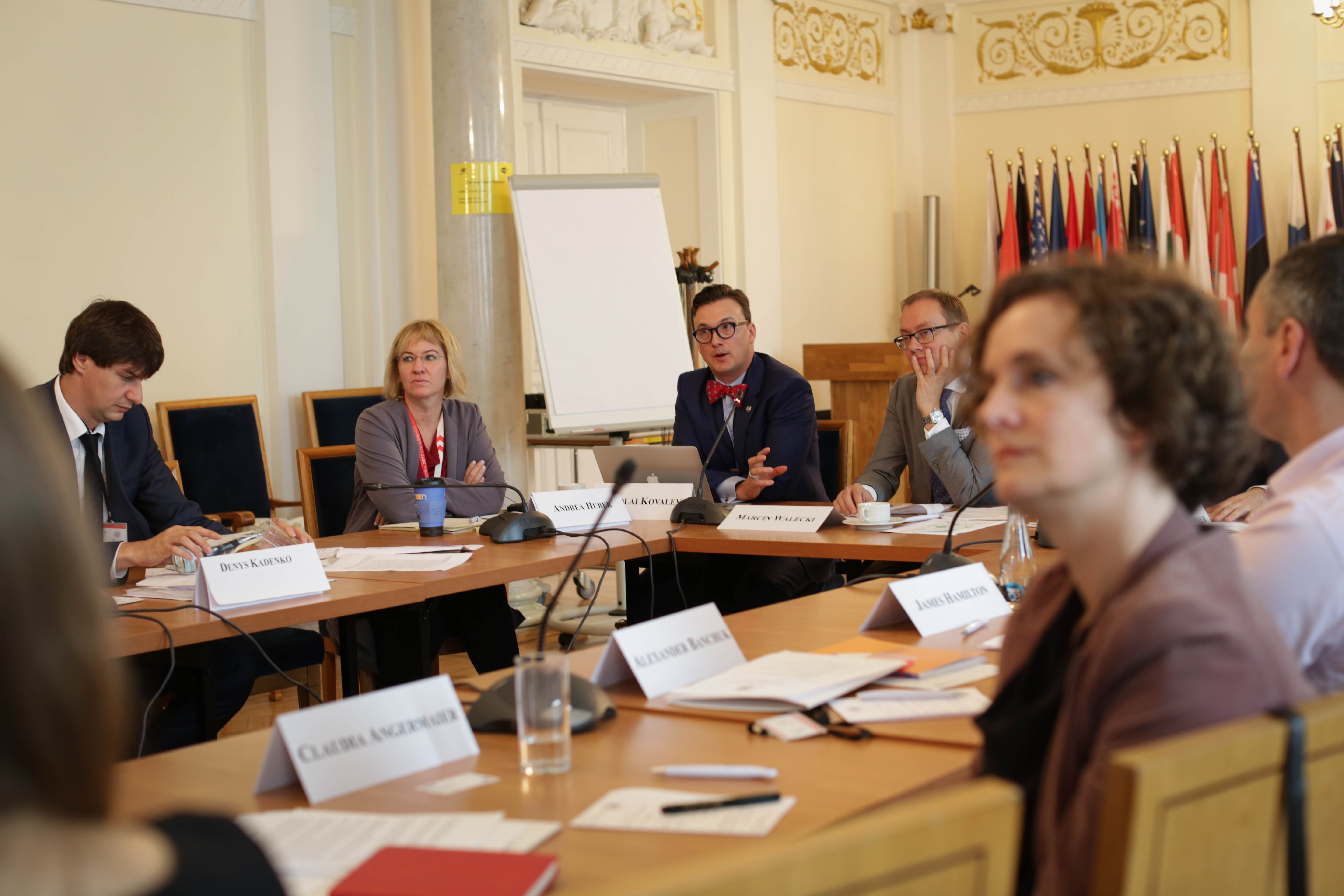 Participants in an expert meeting on strengthening the functional independence of prosecutors in Eastern Europe organized by the OSCE Office for Democratic Institutions and Human Rights (ODIHR) listen to a presentation by ODIHR consultant Nikolai Kovalev. 2 July 2018, Warsaw.