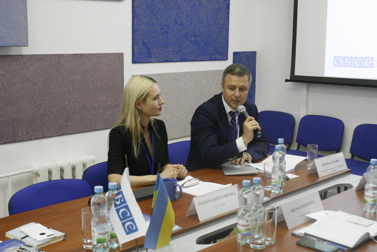 Mykola Kuleba, Commissioner of the President of Ukraine for Children's Rights, presents during a launch event of the Ukrainian translation of Guiding Principles on Human Rights in the Return of Trafficked Persons, as Tatiana Kotlyarenko, ODIHR Adviser on Anti-Trafficking Issues, listens. Kyiv, 21 August 2018.