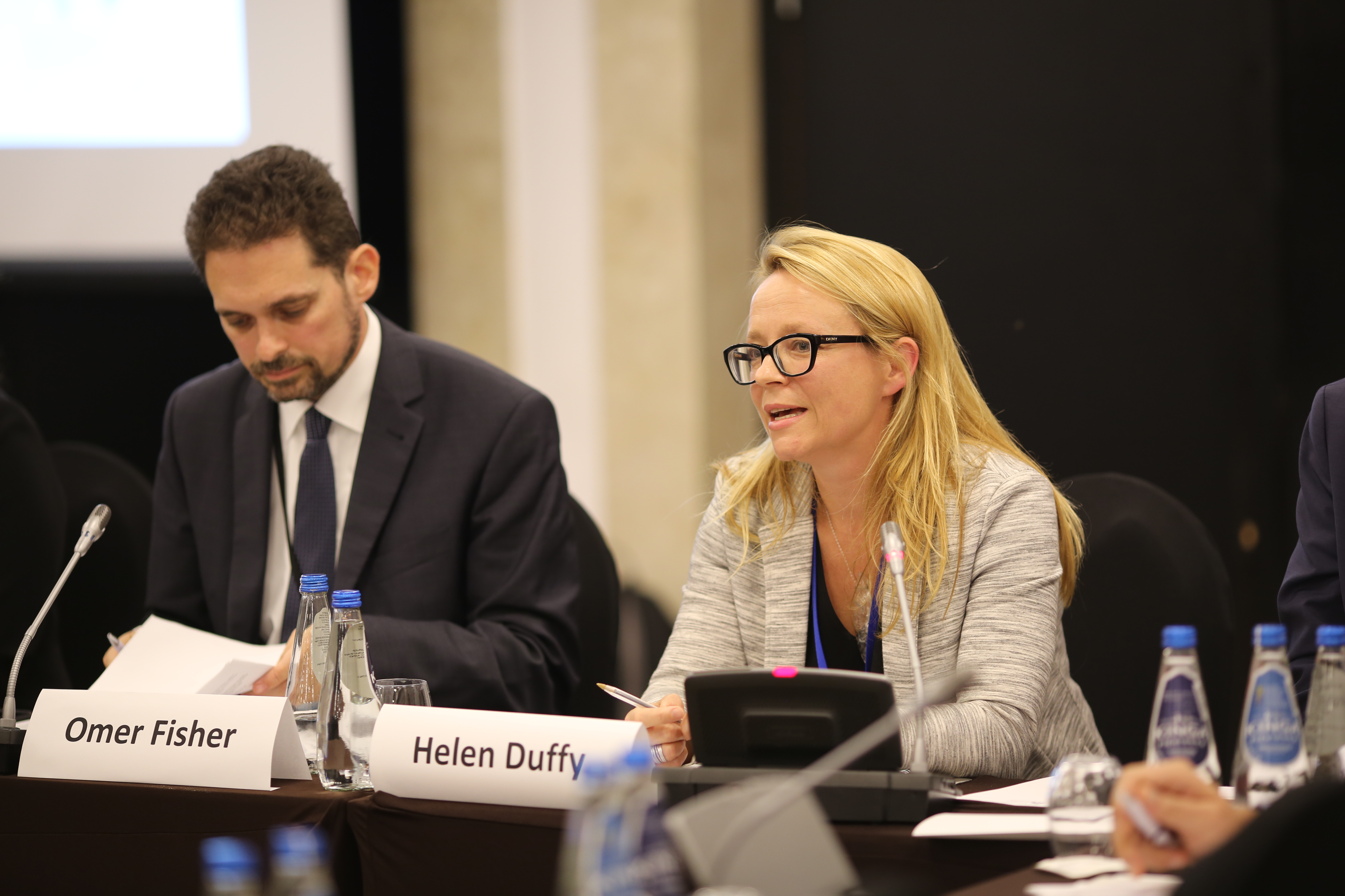 Helen Duffy, the lead consultant for the research and drafting of the ODIHR Guidelines for Addressing the Threats and Challenges of “Foreign Terrorist Fighters” within a Human Rights Framework, speaking at the launch event for the publication, as Omer Fisher, Head of the ODIHR Human Rights Department, listens. Warsaw, 12 September 2018.