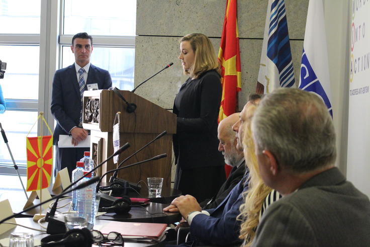 Christie Edwards, Deputy Head of ODIHR's Tolerance and Non-Discrimination department, speaking during a regional conference on addressing the security needs of Jewish communities, which was organized by the OSCE Office for Democratic Institutions and Human Rights (ODIHR) in co-operation with the Ministry of Foreign Affairs of the former Yugoslav Republic of Macedonia and the OSCE Mission to Skopje. Skopje, 13 November 2018.