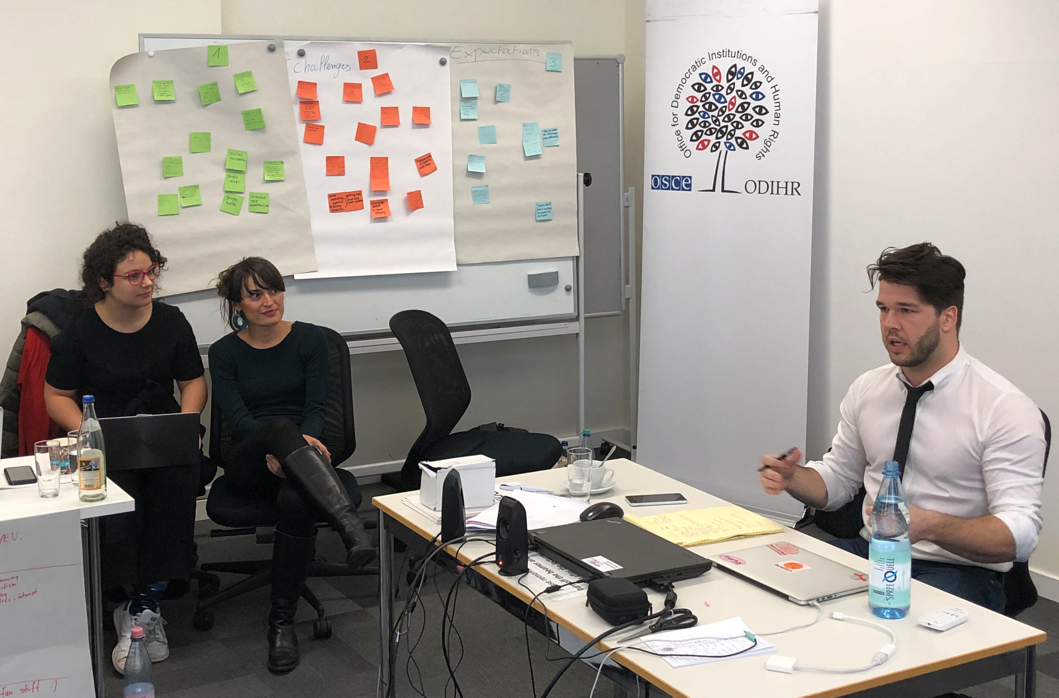 Collin Sullivan from the nonprofit technology company Benetech discussing digital security culture during a training workshop on open source human rights monitoring organized by the OSCE Office for Democratic Institutions and Human Rights (ODIHR) and Benetech for human rights defenders from the OSCE region. Berlin, 14 December 2018.