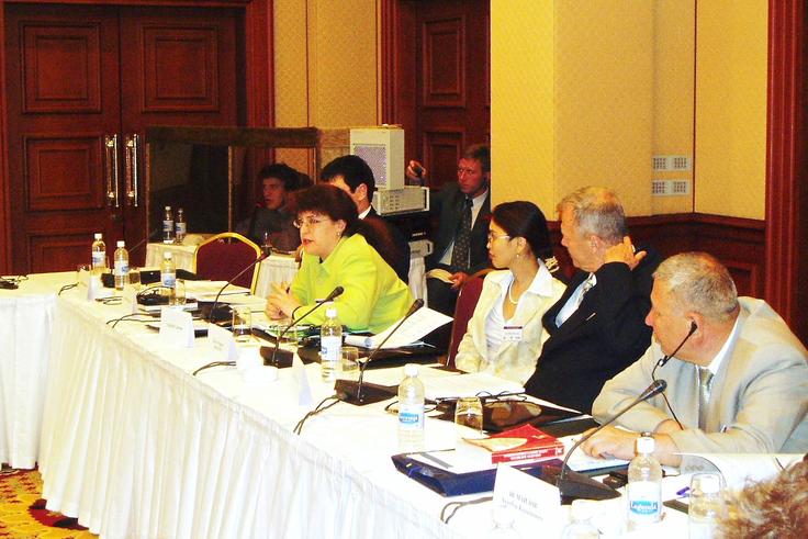 Cynthia Alkon (left), Head of the ODIHR's Rule of Law Unit, speaking at a roundtable on draft amendments to the Kyrgyz Criminal Code and Code of Criminal Procedure, Bishkek, 21 May 2004.