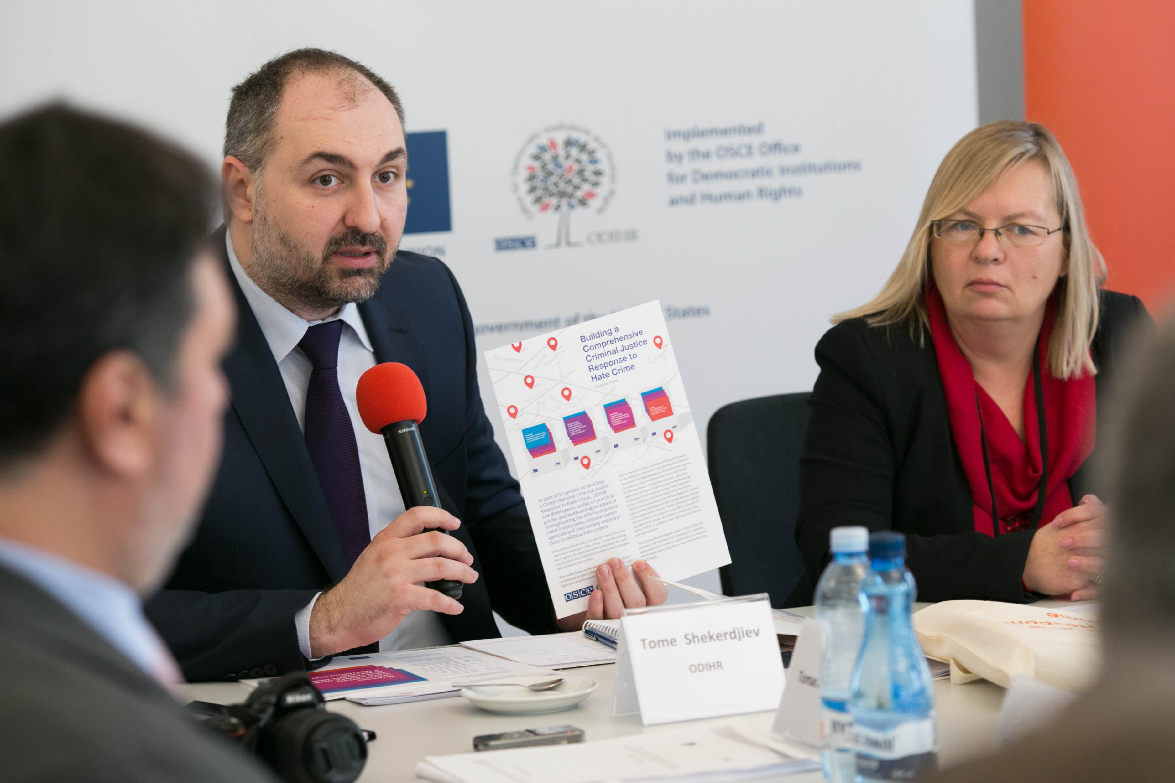 Tome Shekerdjiev (l), Project Manager at the OSCE Office for Democratic Institutions and Human Rights (ODIHR), introduces an ODIHR resource toolkit on building a comprehensive criminal justice response to hate crime to criminal justice and human rights professionals from the OSCE region during a training session organized by ODIHR and the Office of the Commissioner for Human Rights of Poland. On the right is Katarzyna Gardapkhadze, ODIHR First Deputy Director. Warsaw, 20 March 2019.