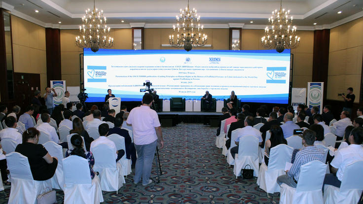 Participants during a presentation of the ‘Guiding Principles on Human Rights in the Return of Trafficked Persons’, a publication by the OSCE Office for Democratic Institutions and Human Rights (ODIHR) recently translated into Uzbek, Tashkent, 30 July 2019.