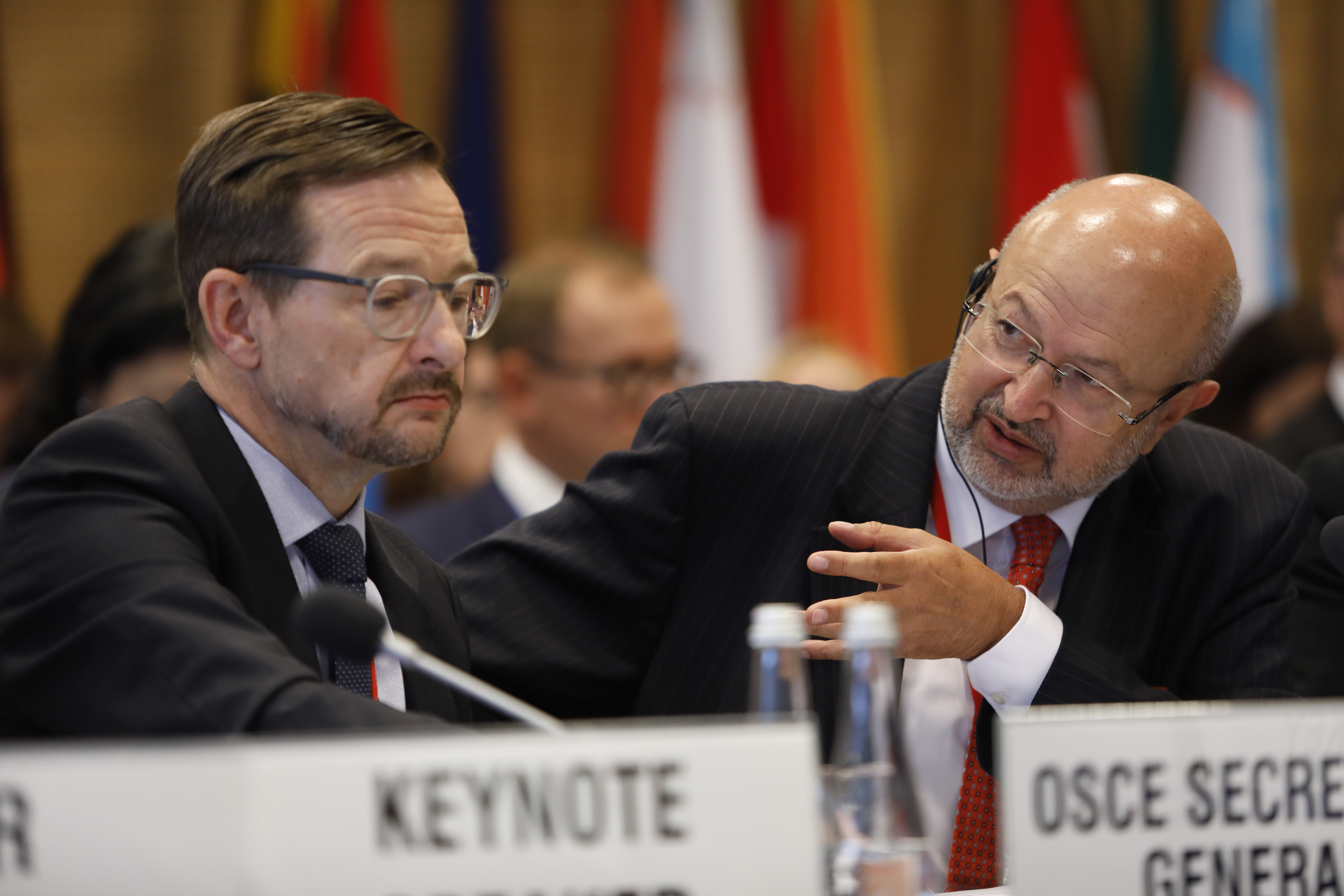 Lamberto Zannier (r), OSCE High Commissioner on National Minorities, speaking at the opening of the 2019 Human Dimension Implementation Meeting, as Thomas Greminger (l), the OSCE Secretary General, listens. Warsaw, 16 September 2019.