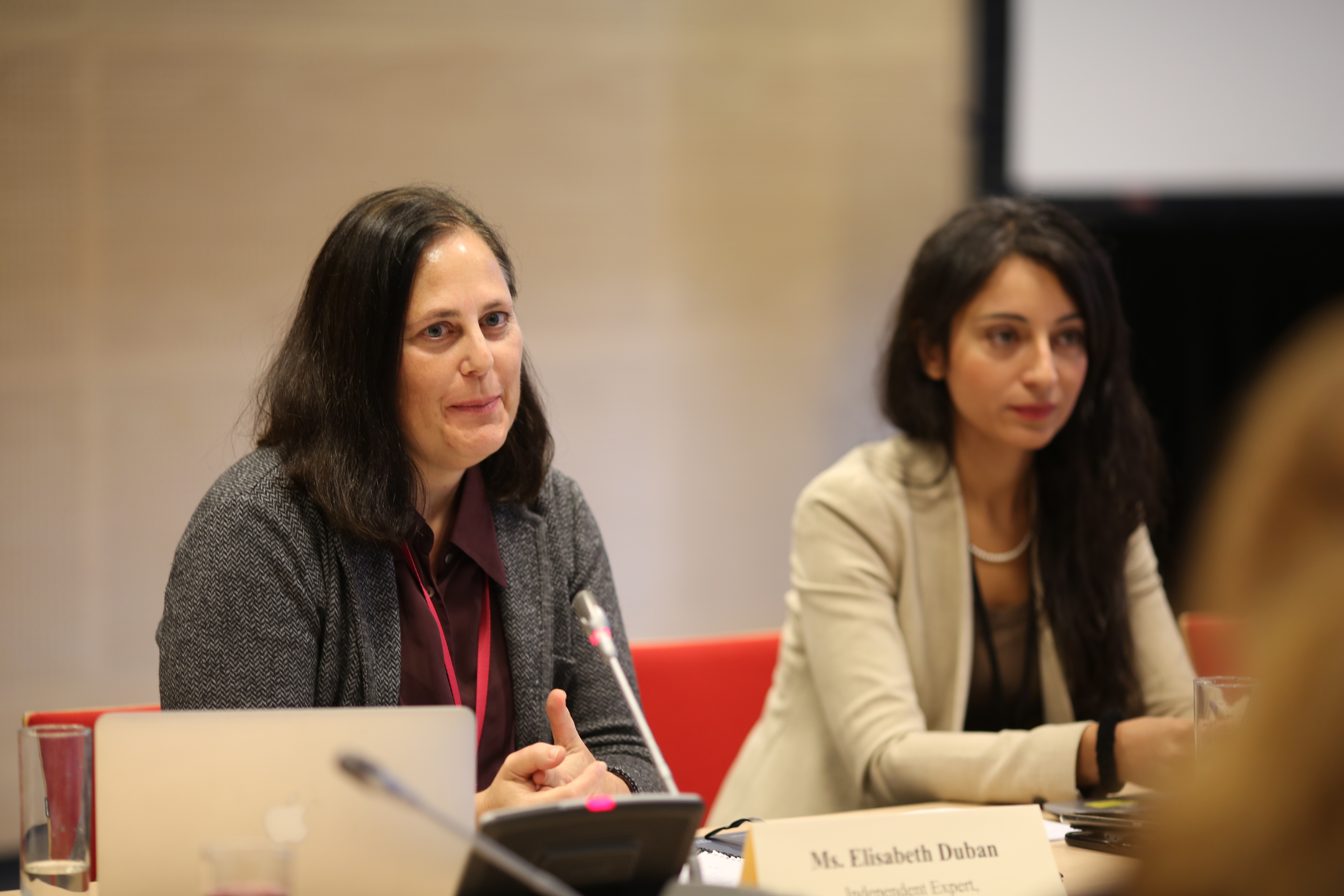 Elisabeth Duban, independent expert and contributor to the ODIHR guide "Preventing and Addressing Sexual and Gender-based Violence in Places of Deprivation of Liberty", speaking at a launch event organized by the OSCE Office for Democratic Institutions and Human Rights (ODIHR) on the margins of the 2019 Human Dimension Implementation Meeting, as Graziella Pavone, ODIHR Human Rights Officer, listens. Warsaw, 23 September 2019.