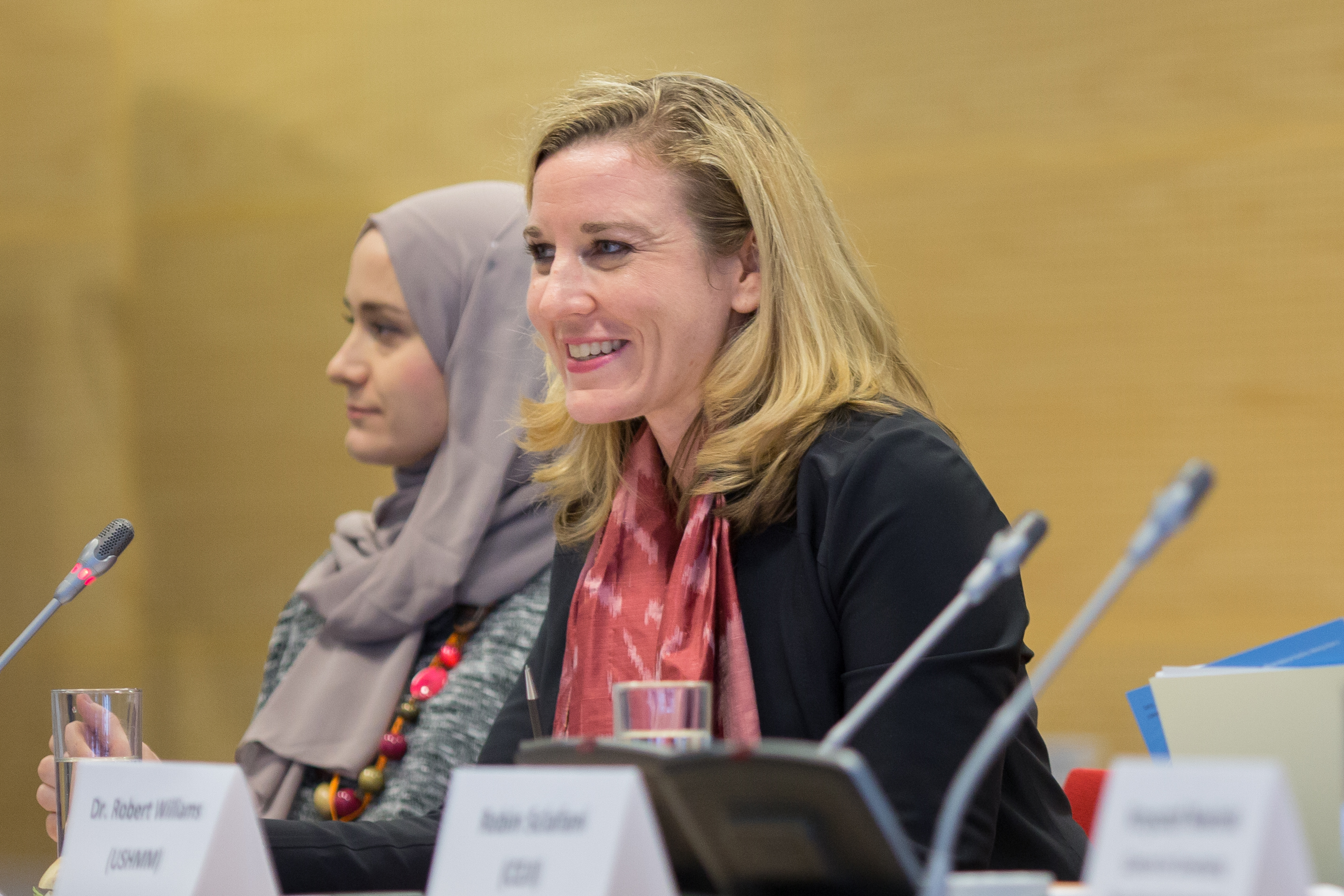 Christie Edwards, Deputy Head of Tolerance and Non-Discrimination Department at the OSCE Office for Democratic Institutions and Human Rights (ODIHR), highlights the role of education in effectively preventing and addressing anti-Semitism, intolerance against Muslims and other forms of discrimination at an ODIHR event in Warsaw. The event took place during the annual OSCE human rights conference, the Human Dimension Implementation Meeting. 24 September 2019.