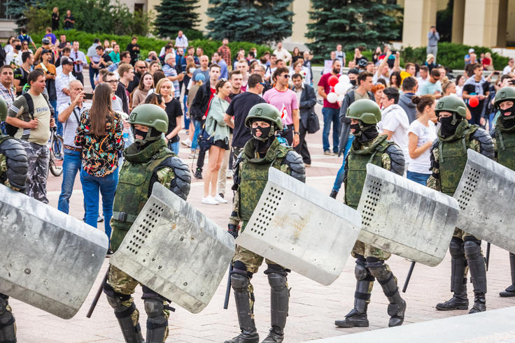 Law enforcement officials and protestors in Minsk, Belarus, on 15 August 2020.