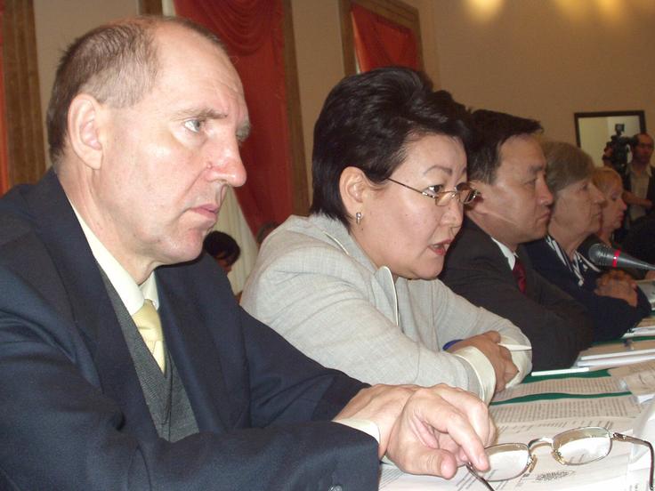 Participants at a forum in Astana discuss Kazakhstan's draft law on national security, 22 April 2005. Nikolai Belorukov, a member of Kazakhstan's Constitutional Court, is left.
