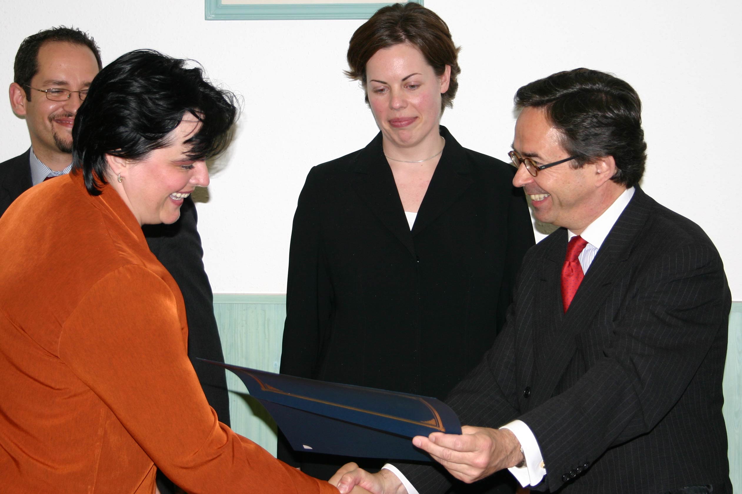 ODIHR Director Christian Strohal hands a certificate to a Hungarian police officer who just completed an ODIHR-sponsored training programme on combating hate crimes, Budapest, 5 May 2005.