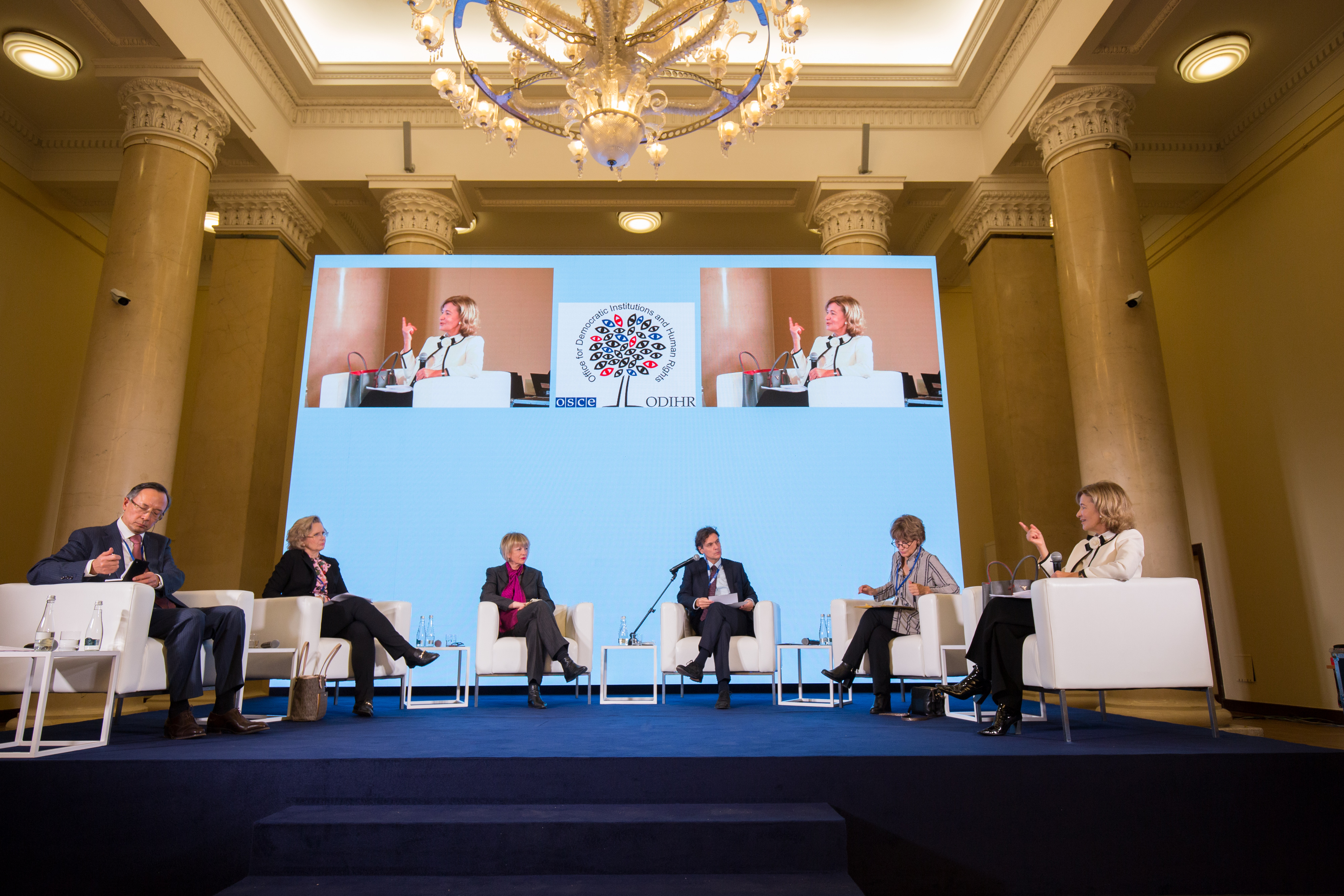 Participants in the high-level panel of ODIHR's 30th anniversary conference (left to right): OSCE High Commissioner on National Minorities Kairat Abdrakhmanov, President of the OSCE Parliamentary Assembly Margareta Cederfelt, OSCE Secretary General Helga Maria Schmid, Amnesty International's Secretary General Agnès Callamard and OSCE Representative on Freedom of the Media Teresa Ribeiro. Warsaw, 14 October 2021.