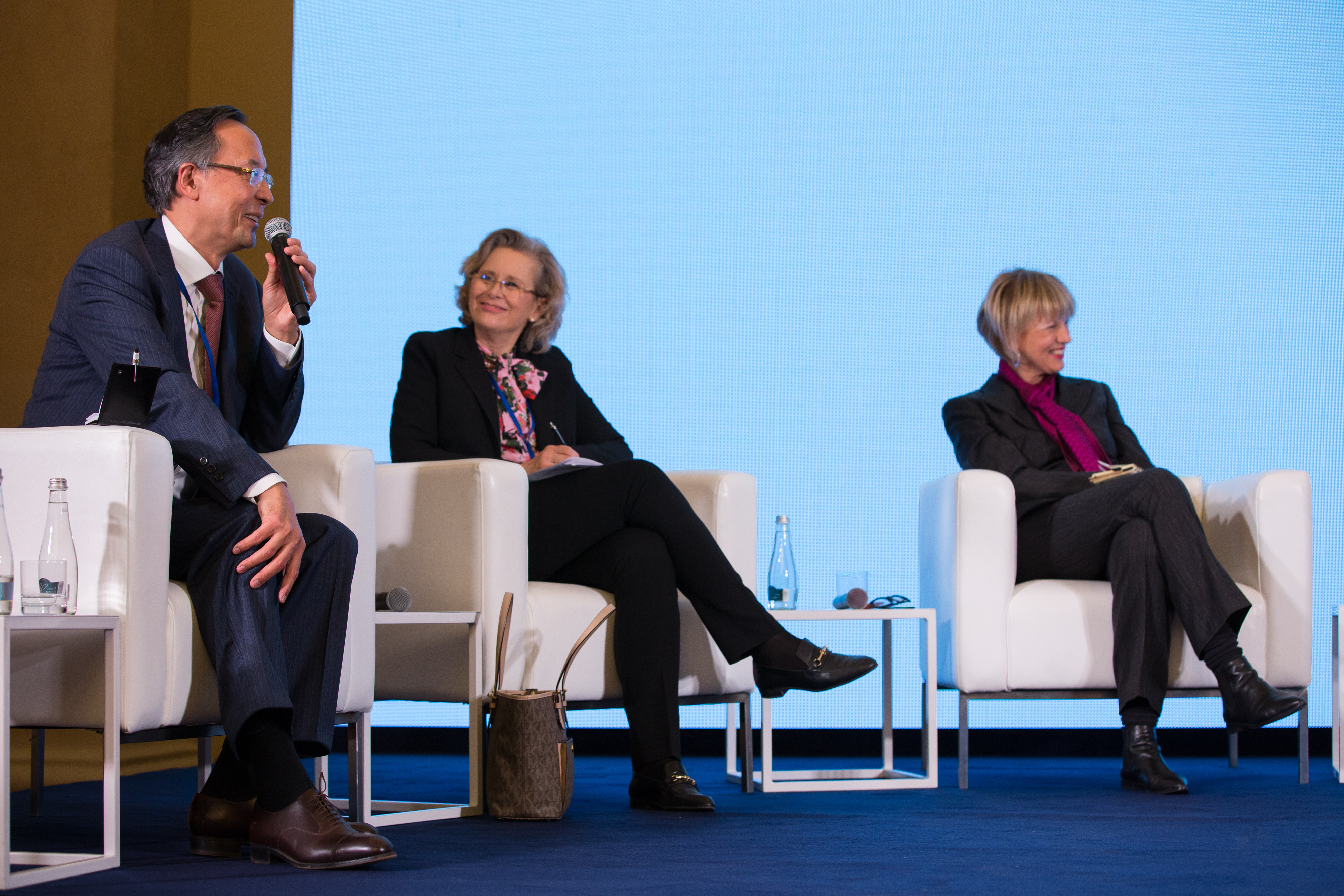 Participants in the high-level panel of ODIHR's 30 anniversary conference (left to right): OSCE High Commissioner on National Minorities Kairat Abdrakhmanov, President of the OSCE Parliamentary Assembly Margareta Cederfelt and OSCE Secretary General Helga Maria Schmid. Warsaw, 14 October 2021.