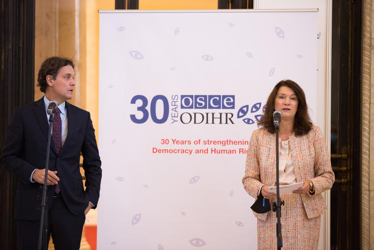Ann Linde, OSCE Chairperson-in-Office and Minister of Foreign Affairs of Sweden (right) and Matteo Mecacci, ODIHR Director, during a press conference on the sidelines of ODIHR's 30 anniversary conference. Warsaw, 14 October 2021.