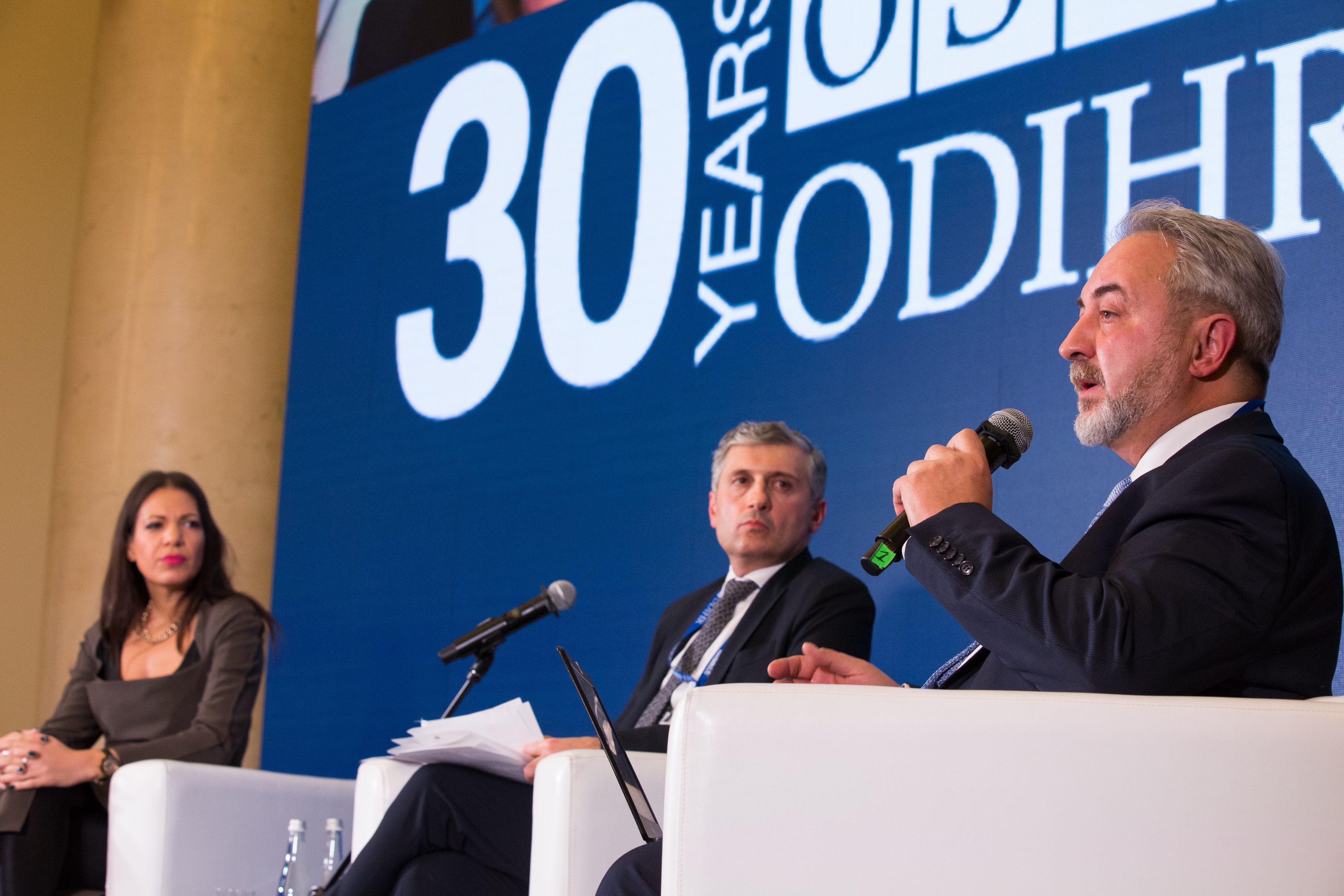 Yuri Dzhibladze of Civic Solidarity Platform participates in a session on democracy as the only legitimate system of government in the OSCE region at ODIHR's 30th anniversary conference. Warsaw, 14 October 2021.