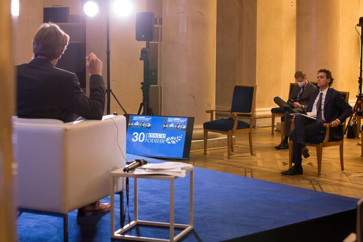 ODIHR Director Matteo Mecacci listening to a panel discussion on promoting and protecting human rights and fundamental freedoms together at ODIHR's 30th anniversary conference. Warsaw, 15 October 2021.