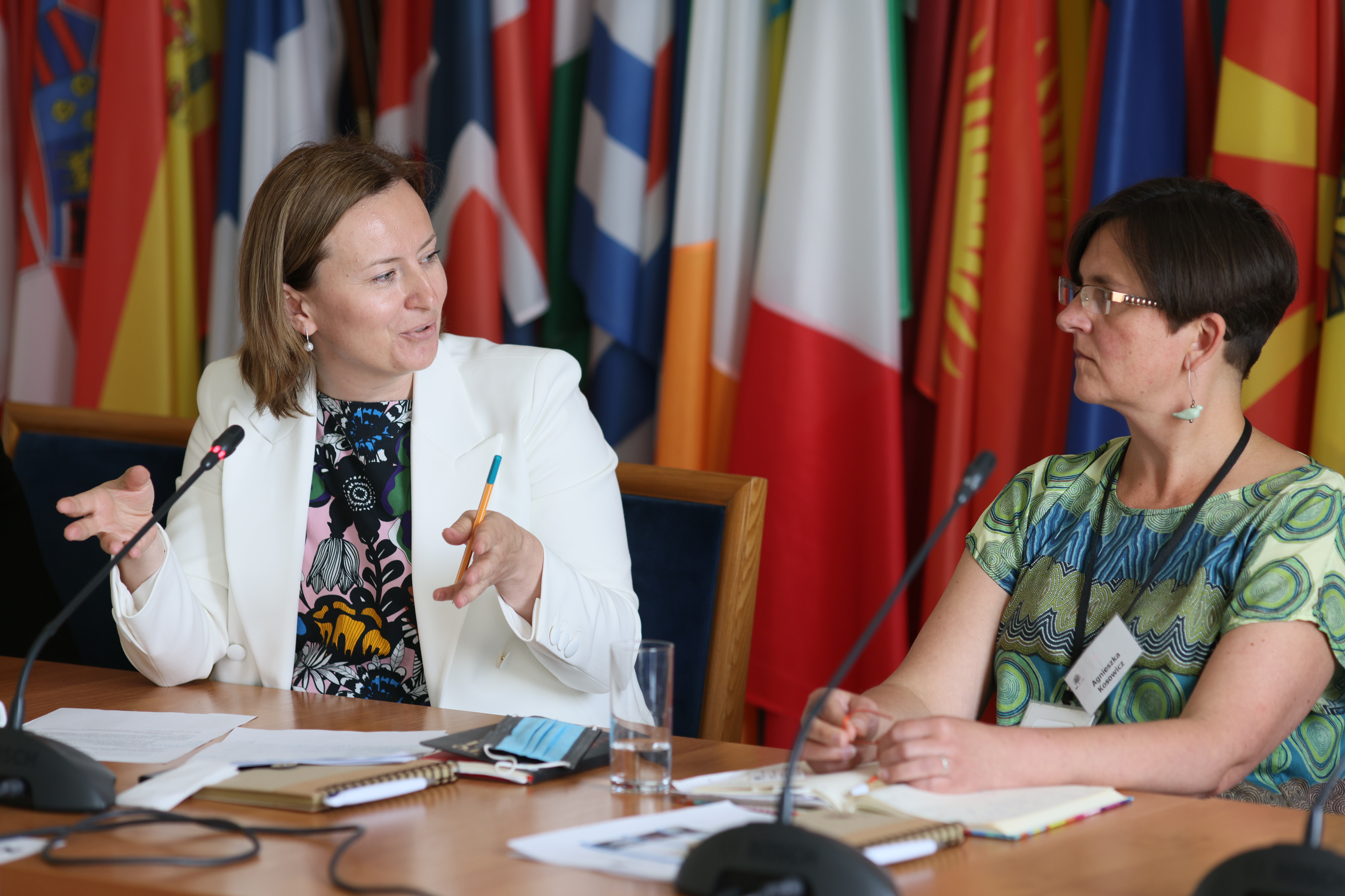 ODIHR First Deputy Director Kateryna Ryabiko (left) and Agnieszka Kosowicz, President of the Board of the Polish Migration Forum (right), at an ODIHR conference on the vital role of civil society in addressing issues related to migration, human rights and inclusion. Warsaw, 27 June 2022.