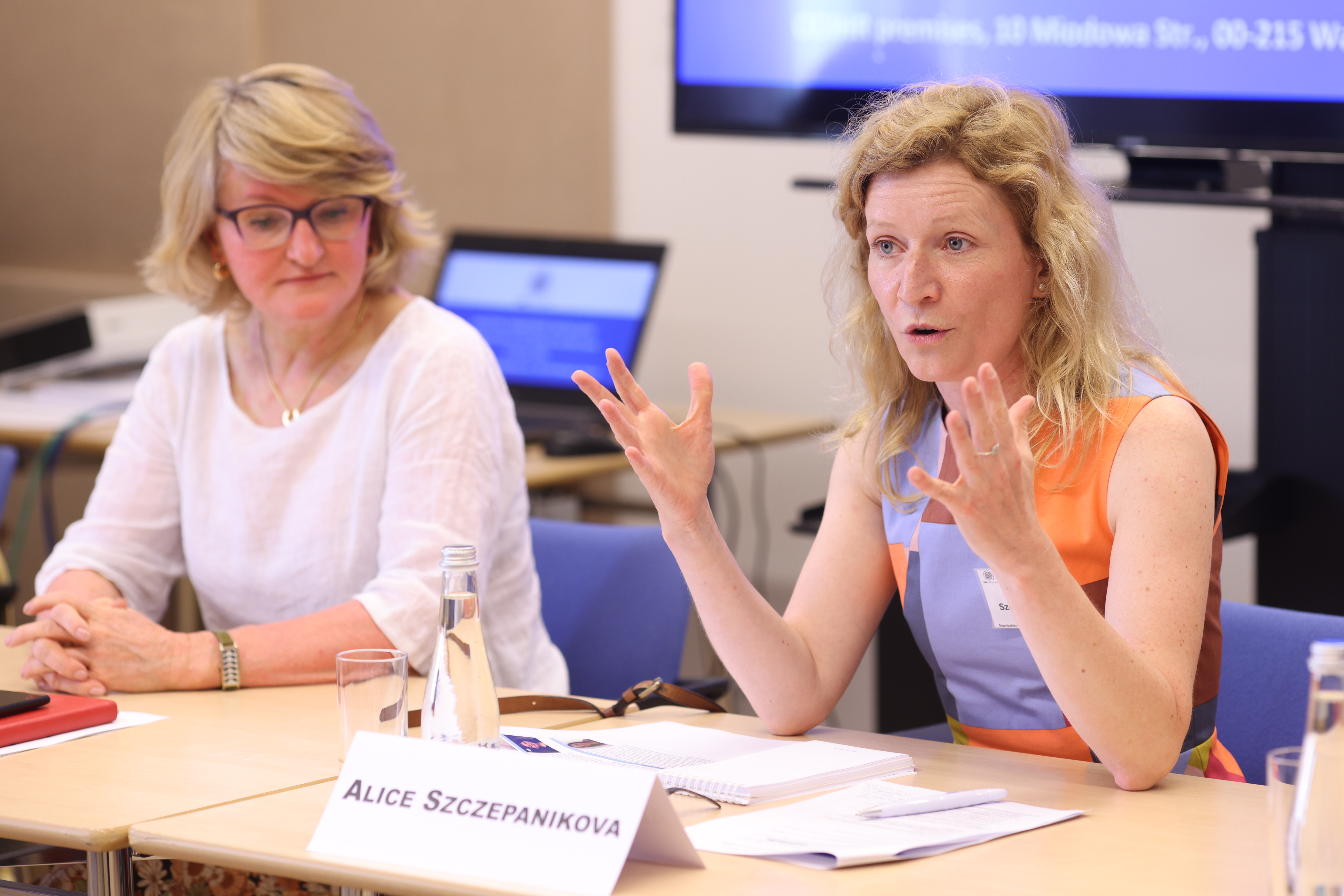 Alice Szczepanikova, ODIHR Migration and Freedom of Movement Adviser (right), and Myroslava Keryk, President of the Board, Our Choice Foundation, Poland (left), at an ODIHR conference on the vital role of civil society in addressing issues related to migration, human rights and inclusion. Warsaw, 28 June 2022.