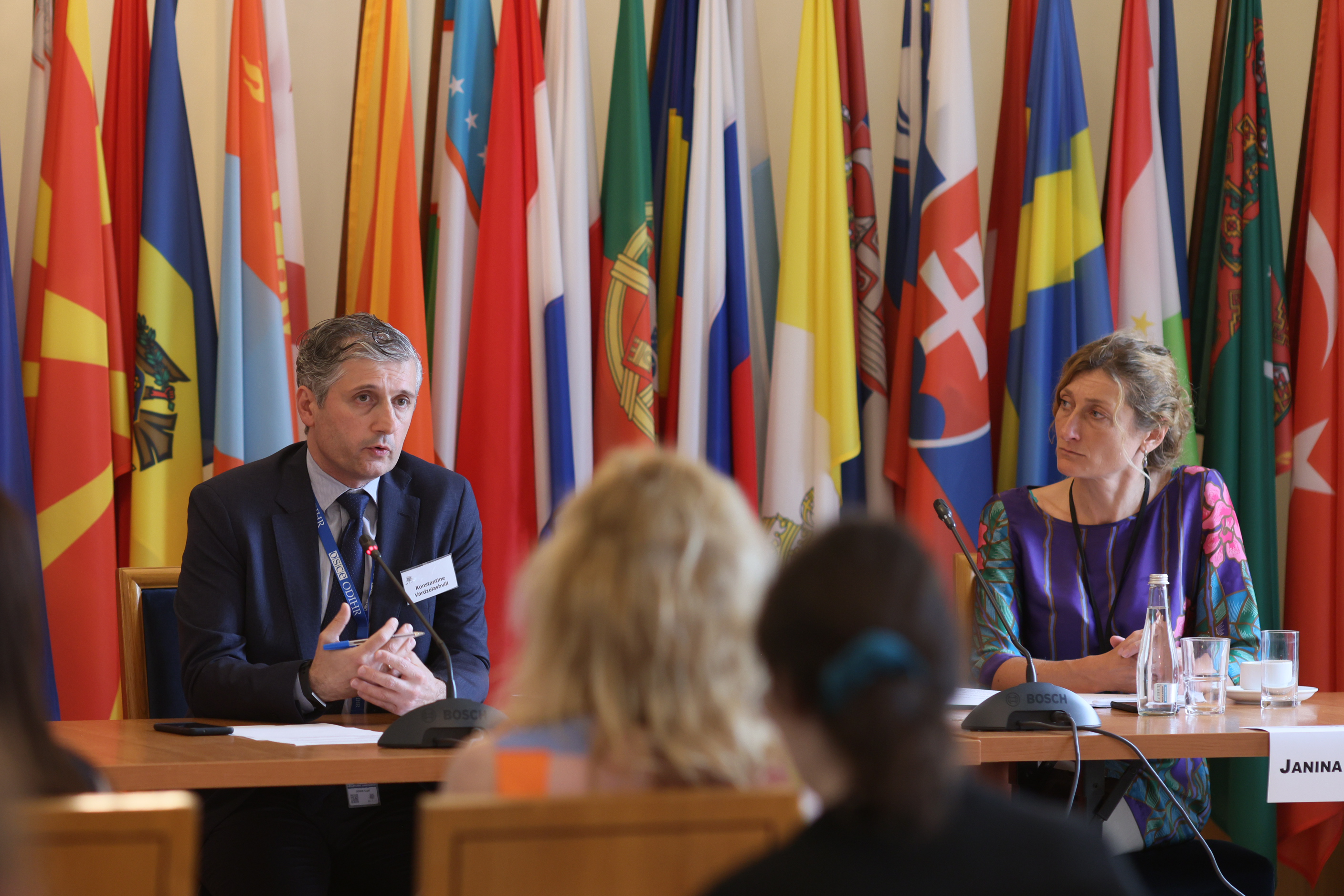 Konstantine Vardzelashvili, Head of the ODIHR Democratization Department (left), and Janina Owczarek of the Polish mission of the International Organization for Migration (right) at an ODIHR conference on the vital role of civil society in addressing issues related to migration, human rights and inclusion. Warsaw, 28 June 2022.