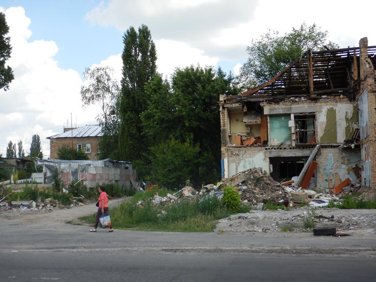 Buildings in Borodianka during a visit by ODIHR monitors to conduct interviews. 1 July 2022.